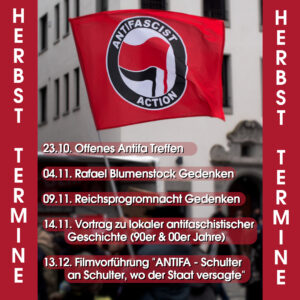 das Offene Antifa Treffen am 23.10 wird von uns organisiert und wird abends stattfinden, meldet euch gerne bei uns wenn ihr daran interesse habt!