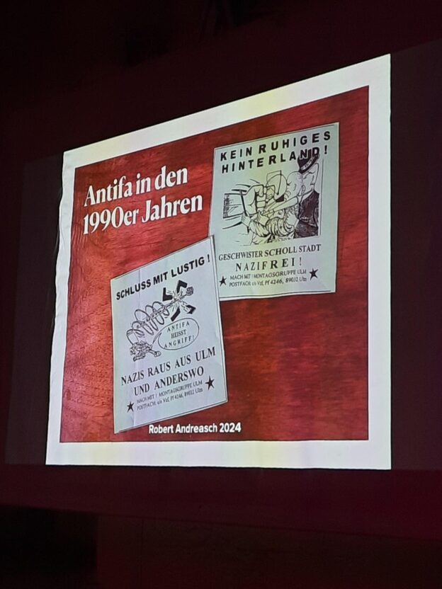 Am Samstag den 16.11.24 hielt Robert Andreasch einen Vortrag zu Antifaschismus in Ulm vor 30 Jahren. Der Vortrag war gut besucht und wir konnten einiges dazu lernen zum historischen Vorgehen von Antifa Gruppen in den 90er und 00er Jahren in der Region.