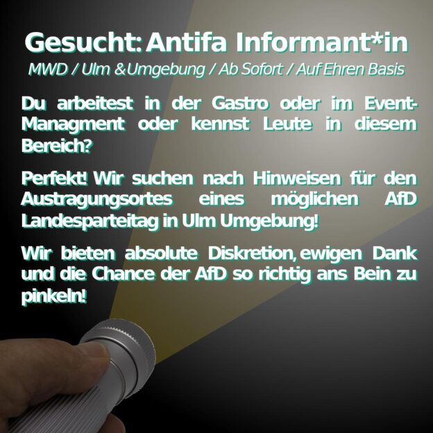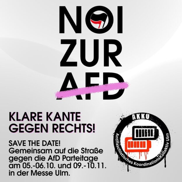 Das wollen wir am 18.09. in Ulm auf der Straße zeigen – schließt euch an und lasst uns uns gemeinsam der Normalisierung der AfD und dem Rechtsruck entgegenstellen!