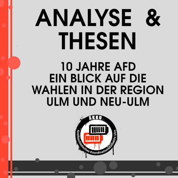 Im bundesweiten Vergleich erzielt die AfD in der Stadt Ulm schlechte Wahlergebnisse, doch wir machen uns keine Illusionen. Auf beiden Seiten der Donau und vor allem außerhalb der Städte legt die AfD immer mehr zu. Aus Neu-Ulm sitzt für die AfD mitdem vom Verfassungsschutz beobachteten Franz Schmid ein offen extrem Rechter im bayrischen Landtag. Auch in Ulm werden ab dem 18.09. mit Nicolas Brickenstein und Daniel Rottmann zwei neue AfD- Gemeinderäte in den Ulmer Gemeinderat einziehen.