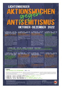 Um diesen Zustand etwas entgegenzusetzen möchten wir, zusammen mit einigen anderen Gruppen und Akteur*innen, im Rahmen einer Veranstaltungsreihe für das Thema Antisemitismus sensibilisieren, Wissen teilen, uns vernetzen und austauschen. Parallel wird es im Bezirk Veranstaltungen zu dem Thema geben, die nicht von uns oder befreundeten Gruppen organisiert wurden, die wir euch allerdings trotzdem ans Herz legen möchten.