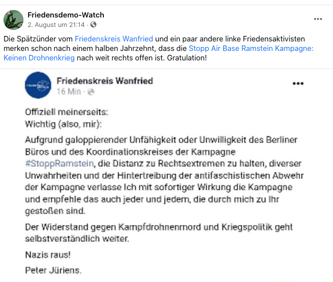 Wie weit Reiner braun bereit ist zu gehen, zeigt ein Post auf der Facebook-Seite von Peter Juriens. Peter Jurins ist wichtig bei Stopp Ramstein, in allen oben gezeigten Videos ist er an prominenter Stelle zu sehen. Peter Juriens behauptet, dass Reiner Braun an der Corona-Schwurbel-Demo, die zum „Reichstagsstürmchen“ geführt hat, teilgenommen habe. Weiter verkündet er: „Aufgrund galoppierender Unfähigkeit oder Unwilligkeit des Berliner Büros und des Koordinierungskreises der Kampagne #StoppRamstein die Distanz zu Rechtsextremen zu behalten, diverser Unwahrheiten und der Hintertreibung antifaschistischer Gegenwehr der Kampagne verlasse ich mit sofortiger Wirkung die Kampagne und empfehle das auch jeder und jedem die durch mich dazu gestoßen sind.“