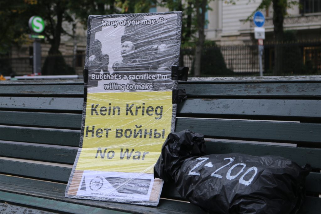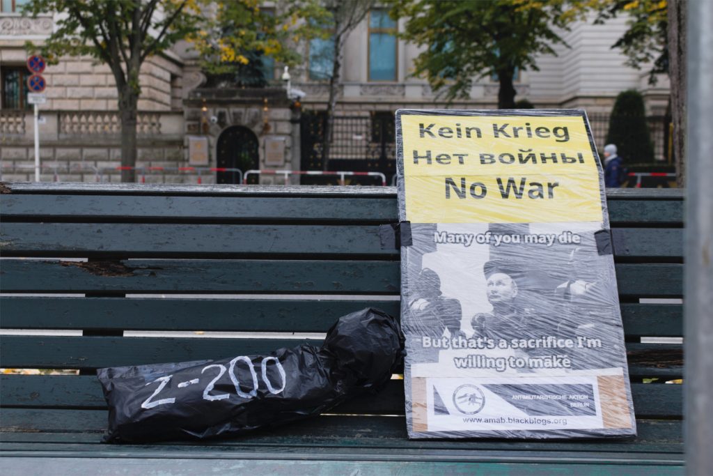 Auch fehle jede ernsthafte Abgrenzung gegen Rechts. „Eine Friedensbewegung, die den russischen Krieg nicht kritisiert, hat ihren Namen nicht verdient und sollte einfach die Klappe halten“, sagt Jan Hansen, Sprecher*in der Antimilitaristischen Aktion Berlin (amab). „Deshalb war für uns klar: Wir machen eine Aktion, die die Angestellten der russischen Regierung in die Verantwortung für ihren verbrecherischen Krieg nimmt.“