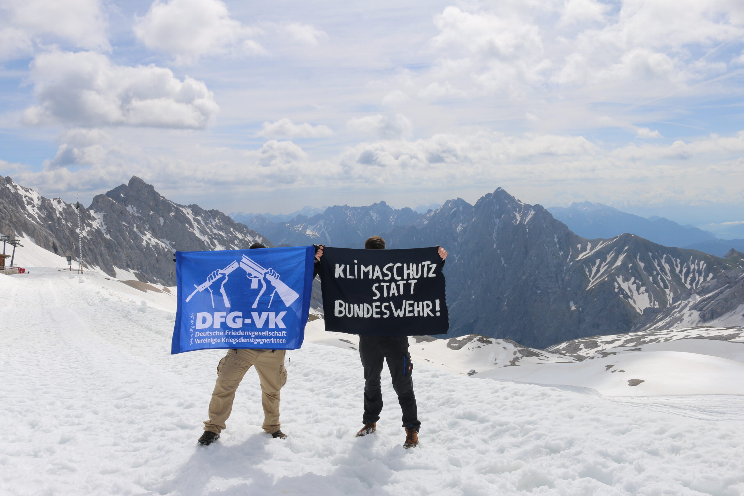 banner klimaschutz statt bundeswehr mit dfg-vk flagge – Kopie