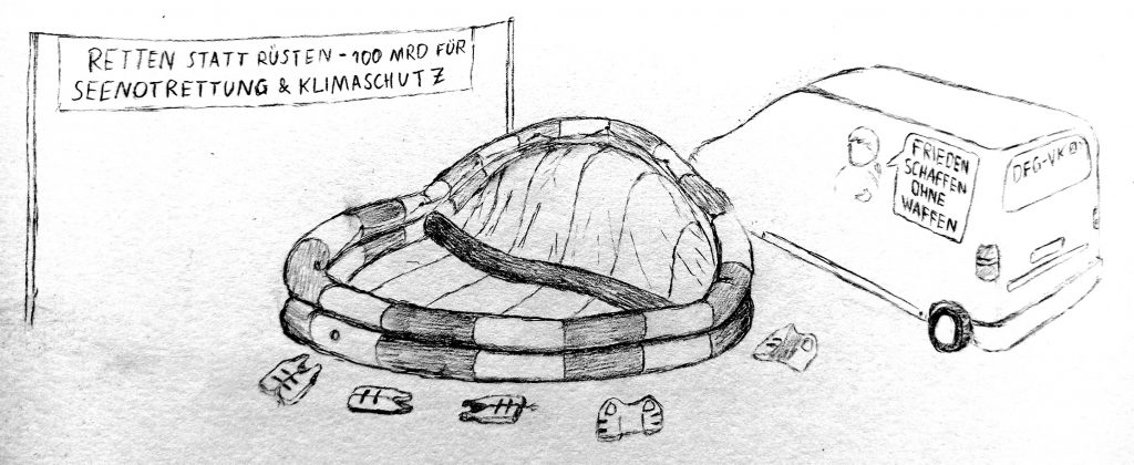 Nach der Invasion der russischen Armee in die Ukraine machte die Bundesregierung 100 Milliarden Euro locker, um die Bundeswehr weiter aufzurüsten. Doch Aufrüstung in Deutschland hilft weder in der Ukraine noch anderswo. Stattdessen müssen wir eine solidarische Politikwende entwickeln. Deshalb fordern wir ein 100 Milliarden Euro Sofort-Investitionsprogramm in Klimaschutz und Seenotrettung.