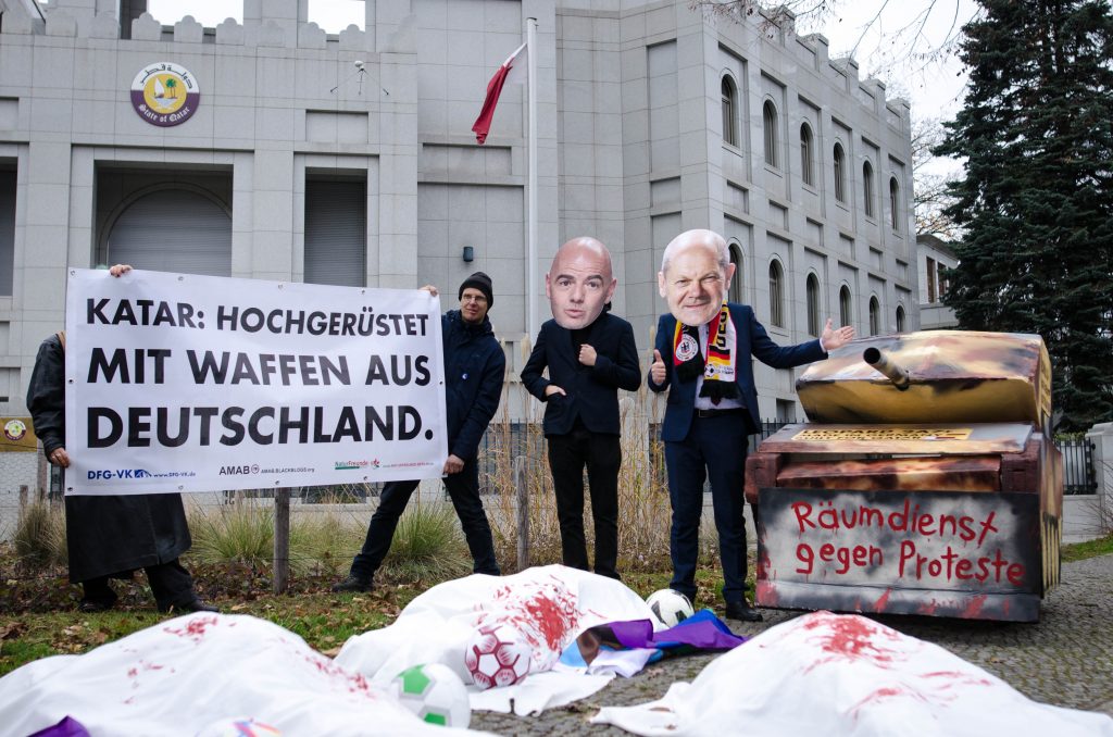 Yannick Kiesel von den ebenfalls an der Aktion beteiligten Naturfreunden Berlin.: „Schon die WM-Vergabe an Katar hatte wohl etwas mit Rüstungsgeschäften zutun: Der damalige UEFA-Präsident Michel Platini gab seine Stimme für Katar, dafür soll das Land den Kampfjet ‚Rafale‘ von Frankreich gekauft haben.“