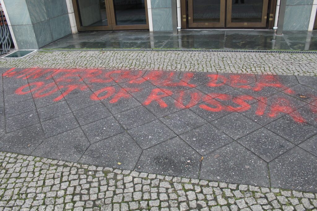 Vor der Tür des Hauptstadt-Büros von DeaWintershall haben Aktivist*innen einen blutroten Slogan mit Farbe hinterlassen. Dort steht: „Dea Wintershall out of Russia!“. Hintergrund ist eine Enthüllung des Spiegels. Der Spiegel schreibt, dass der Treibstoff für russische Bomber, die die Menschen in der Ukraine bombardieren, aus Rohstoffen von DeaWintershall gemacht wird. DeaWintershall sagt, dass stimme alles nicht. Und falls es doch stimme, könne DeaWintershall nichts dafür.