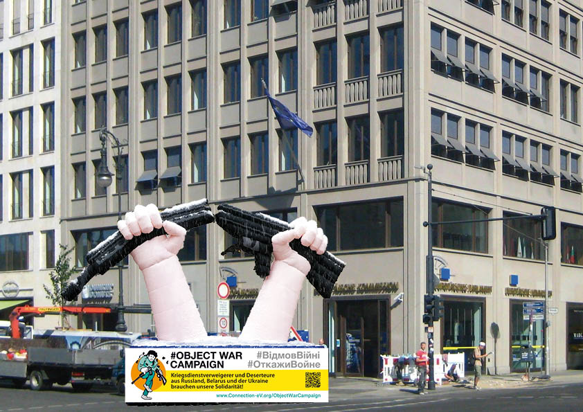 Am Donnerstag, den 8.12.22 um 11h demonstrieren wir mit anderen Friedens- und Menschenrechtsorganisationen mit einem übergroßen aufblasbaren zerbrochenen Gewehr für die Rechte der Verweigerer und Deserteure vor dem Europäischen Haus (Sitz der EU-Kommission, Unter den Linden 78, 10117 Berlin).