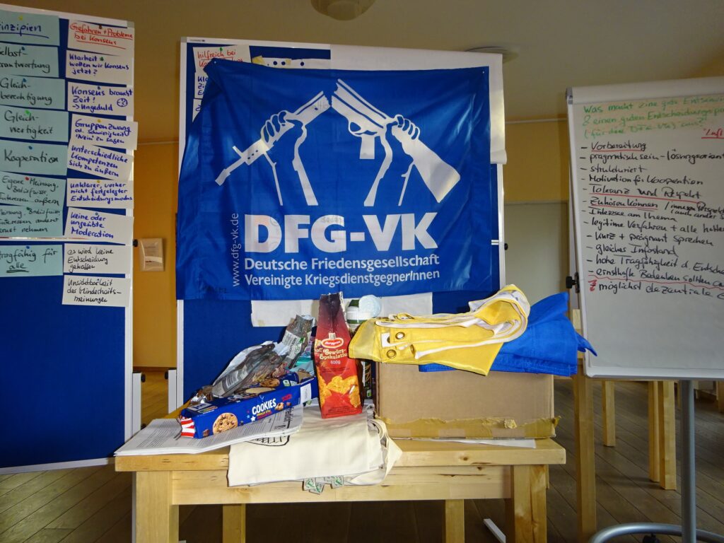 Deli 1: Bereits beim Sammeln dieser schönen Dinge sagte die Workshopleitung: „Ihr braucht euch nicht zu melden, ruft das einfach so rein!“ Wer die DFG-VK kennt, weiß, dass das ne ganz schlechte Idee ist…. und so kam es auch.