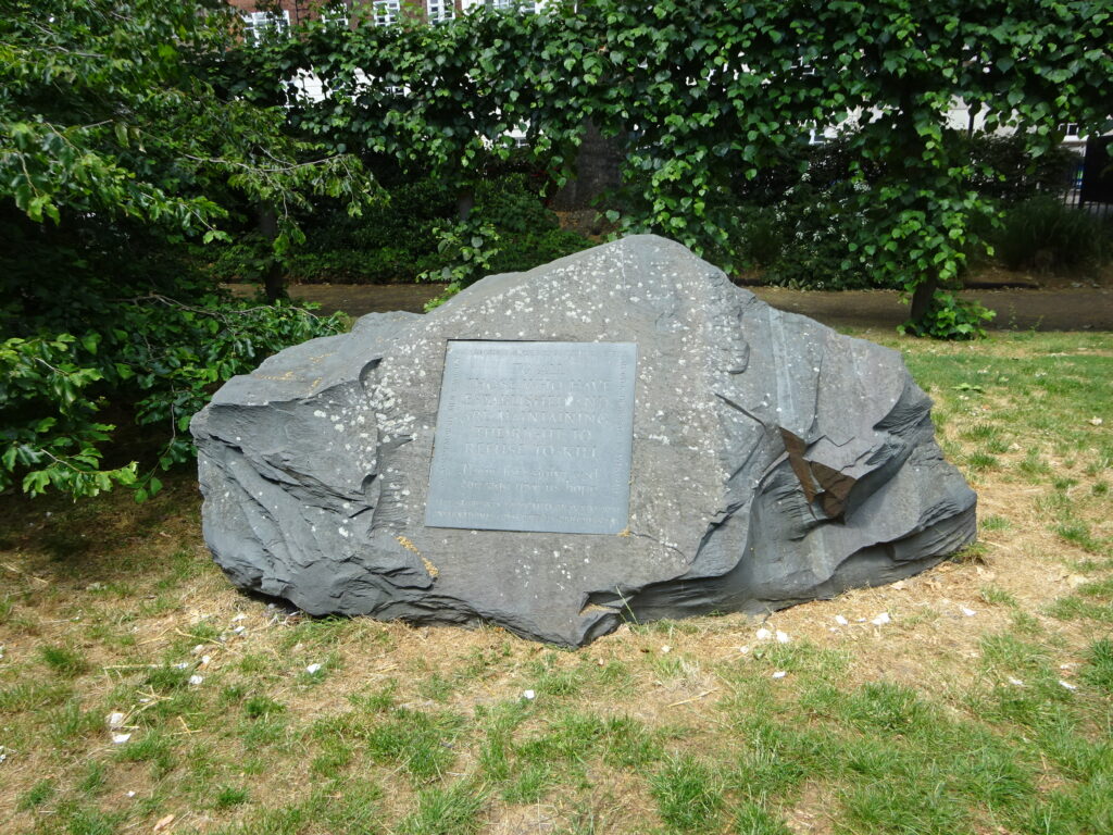 Gedenkstein für Deserteure und Kriegsgegner*innen im Park hinter der Hütte der Qqäker*innen.