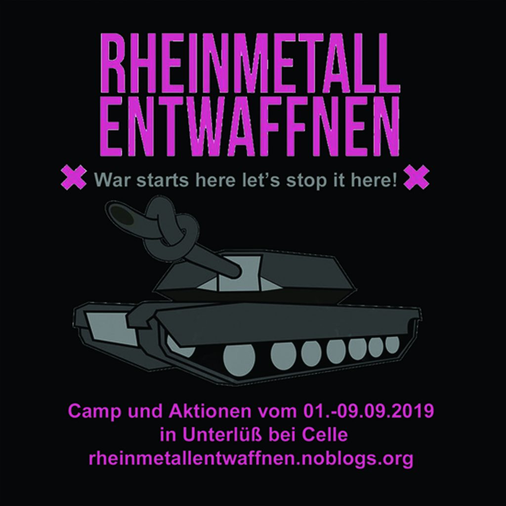 In der Zeit vom 01.09. bis 09.09.2019 werden wir, gemeinsam mit vielen Menschen, am Produktionsstandort von Rheinmetall in Unterlüß ein Camp und vielfältige antimilitaristische Aktionen durchführen. Unser Ziel ist es, am Beispiel Rheinmetall ein klares Zeichen gegen Rüstungsproduktion und -exporte zu setzen und eine breite Öffentlichkeit auf das Treiben der Konzerne und ihrer Helfer*innen in der Politik aufmerksam zu machen.