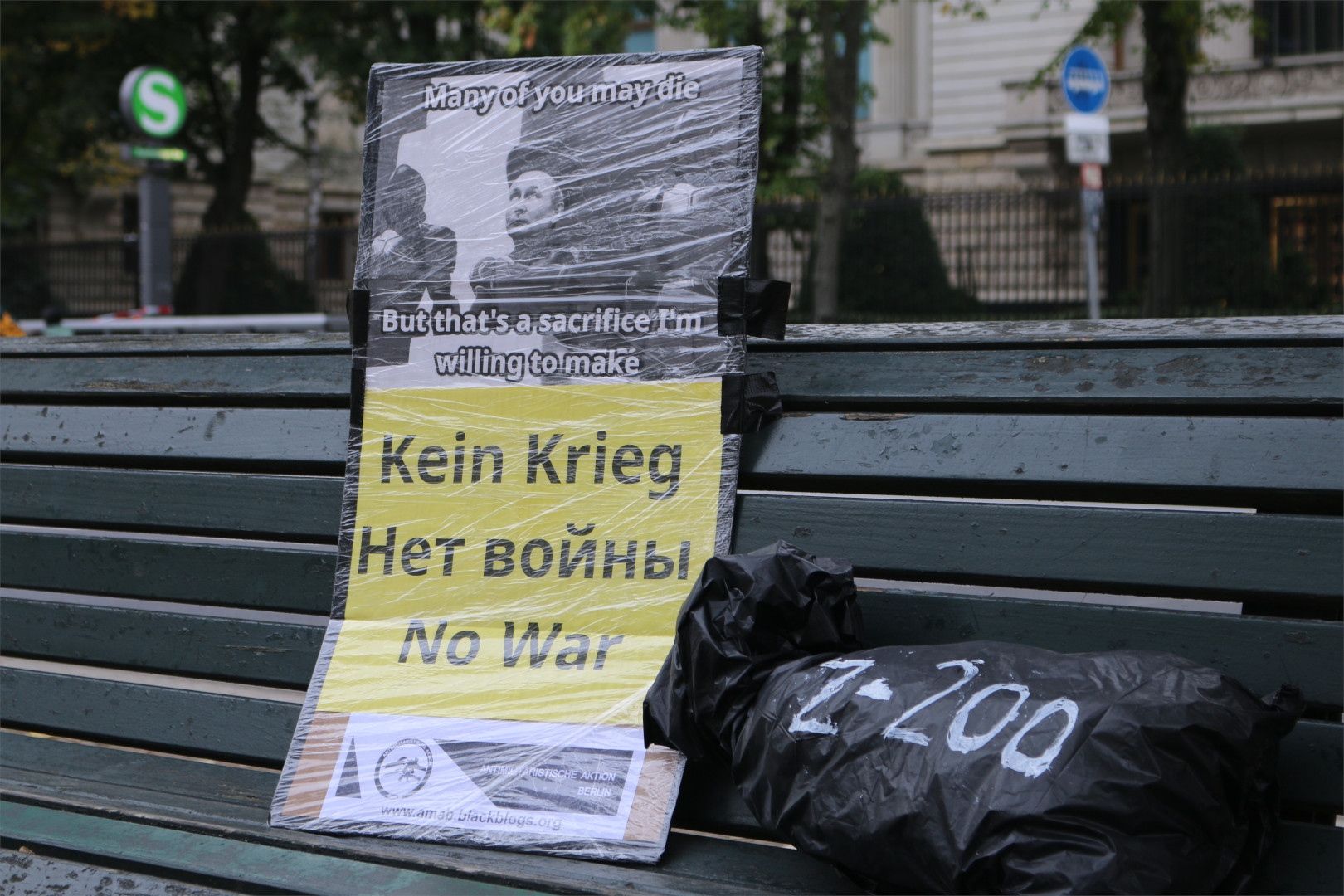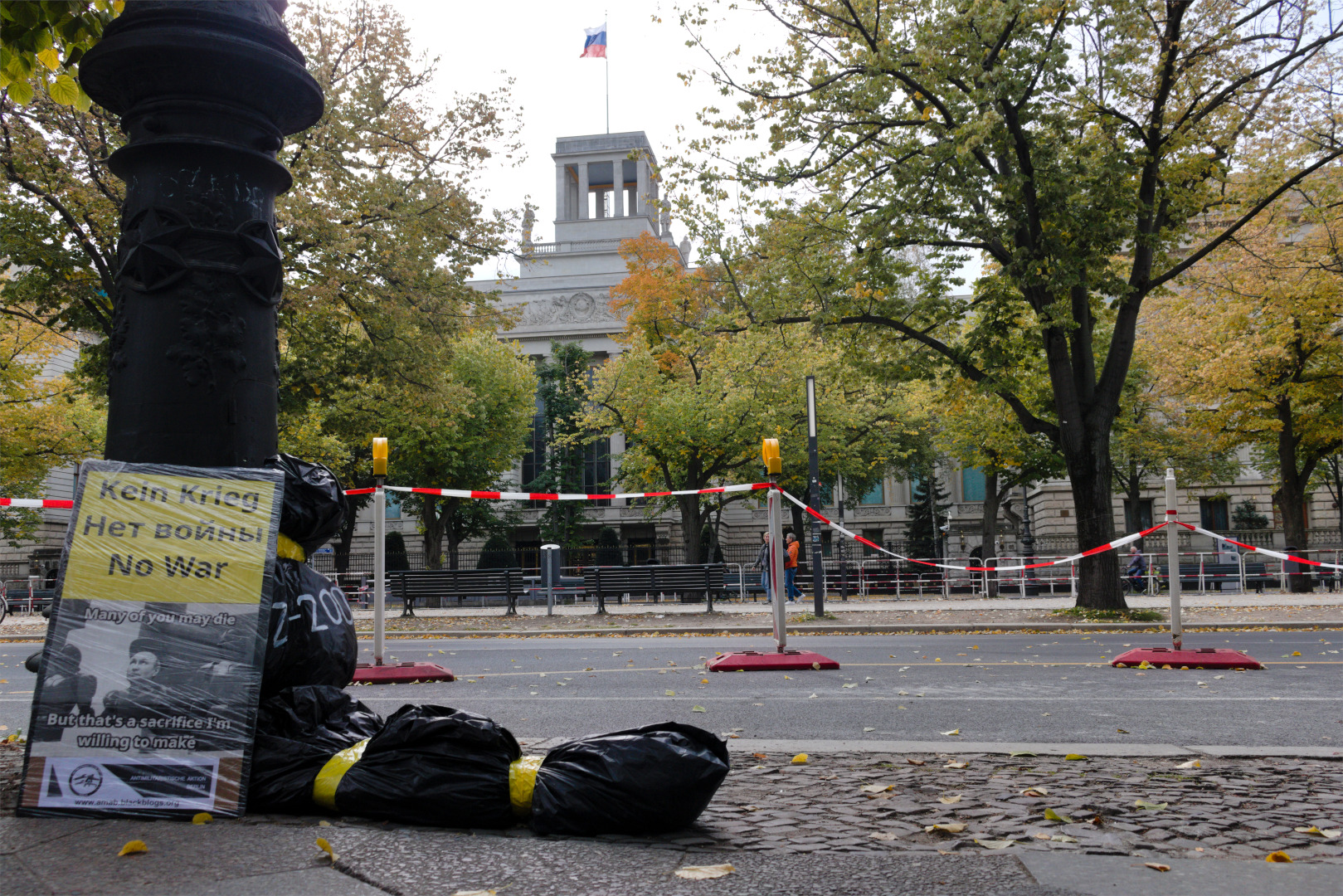 Another protest action of Antimilitarist Action Berlin might have creeped out the employees of the Russian Embassy in Berlin “Unter den Linden” and of the Russian Cultural Institute in Friedrichstraße. Antimilitarist Action Berlin placed black trash bags around the embassy. The trash bags were made to resemble body bags and labeled with “Z-200”. The group’s statement explained: “The Russian government is waging a murderous and criminal war of aggression in Ukraine. We call on the employees of the Russian embassy to do everything in their power to make their government stop the war and withdraw their army from Ukraine.”