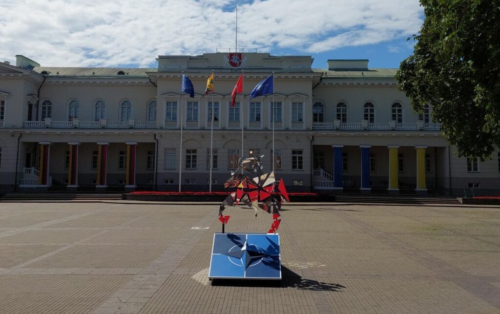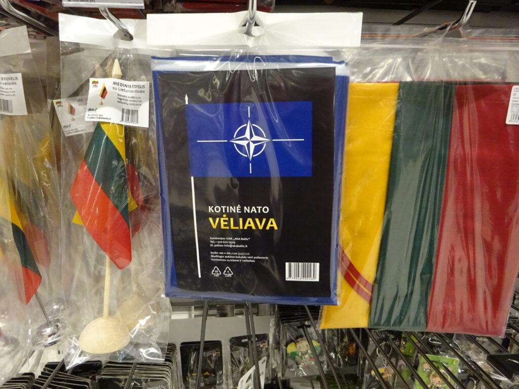 Die passenden blau-weißen Winkelemente mit der Nato-Kompassrose kann man zusammen mit der blau-gelben Fahne in Vilnius bequem im Supermarkt erwerben um seine Unterstützung für das Militärbündnis auszudrücken. Auch die Nato-Werbung in Werbevitrinen und am Präsidentenpalast erfreut sich allgemeiner Unterstützung.