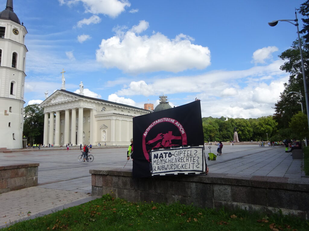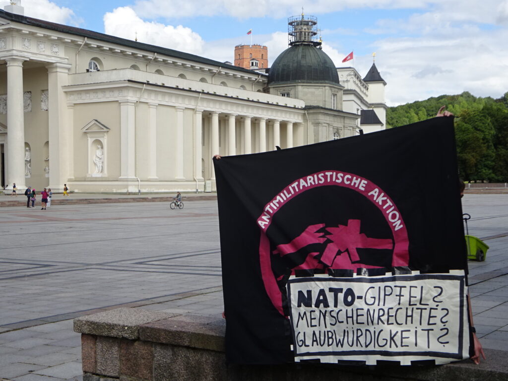 Die Antimilitaristische Aktion Berlin hat anlässlich des NATO-Gipfels 2023 in Vilnius demonstriert. In der litauischen Hauptstadt zeigten wir am zentralen Kathedralenplatz ein Banner. Eingeladen zu dieser Anti-Nato-Aktion haben wir auch António Guterres, Uno-Generalsekretär, Papst Franziskus und Dr. Heinz Fischer, Bundespräsident der Republik Österreich, a. D. Auf unserem Banner stand neben unserem Wappen: „Nato-Gipfel? Menschenrechte? Glaubwürdigkeit?“
