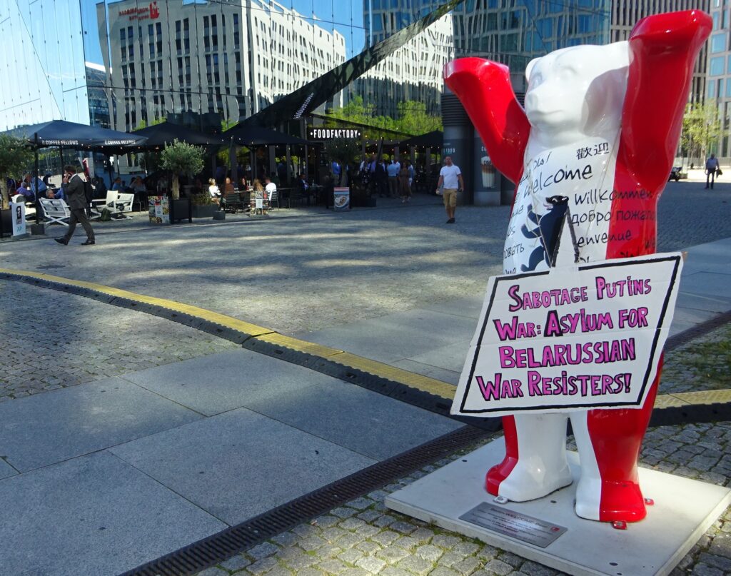 Der Welcome-Buddy-Bär am Berliner Hauptbahnhof wirbt für Asyl für Kriegsdienstverweigererinnen aus Belarus. Dafür haben Aktivistinnen der Antimilitaristischen Aktion Berlin anlässlich des Aktionstages „Stoppt das Töten“! gesorgt. Der „Welcome-Bär“ trägt die rot-weißen Farben Berlins, welche auch von der belarussischen Demokratie-Bewegung genutzt werden. Die Aktivist*innen hängten dem Bären ein Schild in Form einer Sprechblase um. Auf diese Weise legte die Antimilitaristische Aktion Berlin dem Bären folgendes Statements in den Mund: „Sabotage Putin’s War: Asylum for Belarusian war resisters!“ und „Solidarity with Belarus: Asylum for Olga Karatch!“