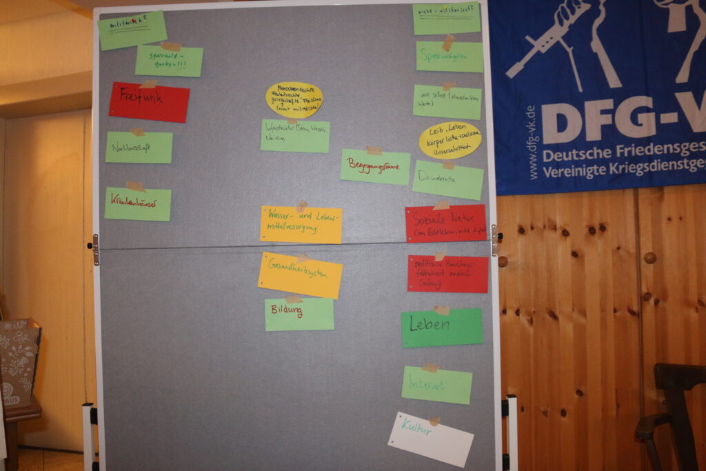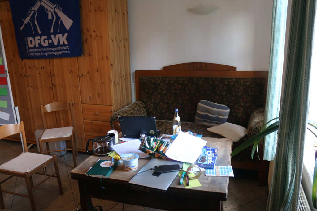 Aufgrund unserer Abreisezeiten blieb uns am Sonntag neben Frühstück, Aufräumen und Mittagessen leider nicht viel Zeit. Wir haben sie dennoch genutzt, um ein weiteres Mal über unsere politischen Weltbeherrschungs-Pläne, etwa in Bezug auf Waffenlieferungen aus Deutschland nach Russland zu sprechen und wie wir diese in einer breiten Öffentlichkeit problematisieren können.