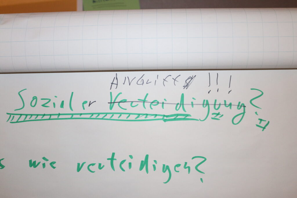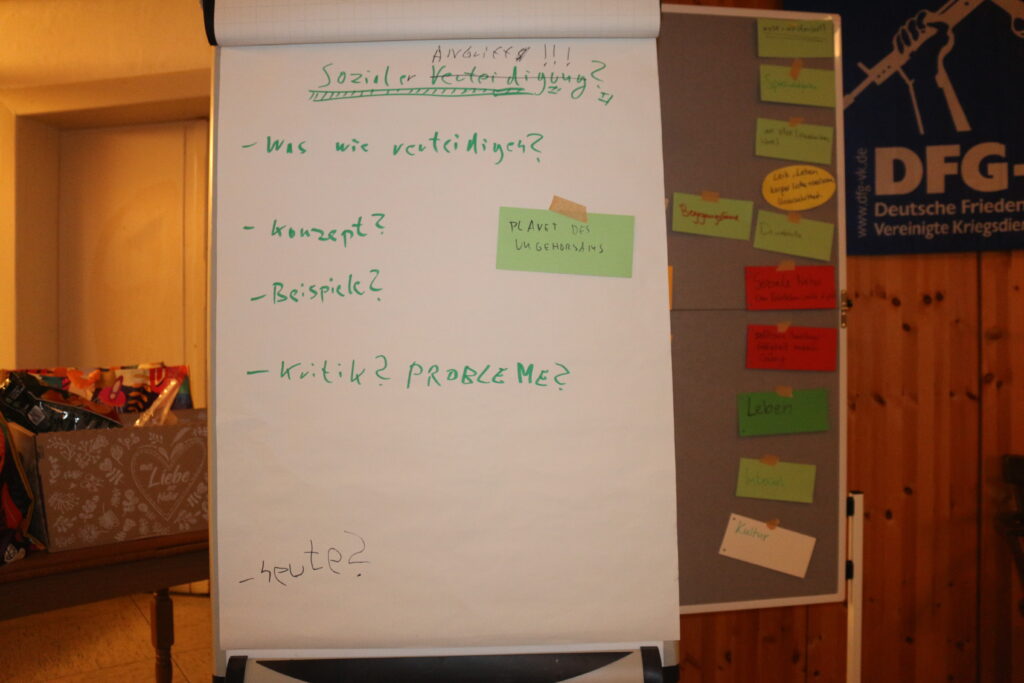 In einem Workshop haben wir das Konzept der sozialen Verteidigung kennengelernt. In der anschließenden Diskussion haben wir festgestellt, dass wir „Soziale Verteidigung“ gerne mit einer offensiven Komponente zu „Sozialem Widerstand“ erweitern würden. Darunter verstehen wir die praktische Anwendung von Sozialer Verteidigung um gesellschaftliche Veränderung herbeizuführen oder, im Falle eines Angriffs, vorzubeugen.