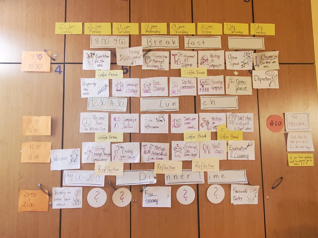 Der Dienstag war komplett der Kampagnenplanung gewidmet. In kurzen eindrücklichen Präsentationen erklärten Thomas und Danai uns alles zu Strategien und Taktiken der Kampagnenplanung. Mit diesem Wissen konnten wir in unsere erste Recherche für unsere eigene Kampagne starten. Am Abend reflektierten wir dann, wie auch schon am Abend davor, gemeinsam den Tag. Dafür fanden wir uns in Gruppen zusammen und tauschten uns darüber aus, wie es uns geht, was wir vom Tag mitgenommen haben und ob es Sachen gibt, die uns noch beschäftigen. Diese Einheit half mir jeden Abend sehr, den Tag nochmal Revue passieren zu lassen, dadurch Eindrücke besser zu verarbeiten und ein wenig zur Ruhe zu kommen.