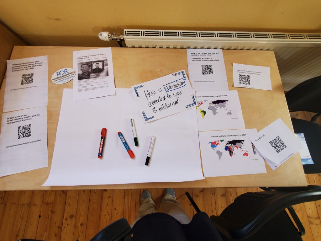 Für die nächste Session verteilten Thomas und Danai verschiedene Info-Points zum Thema „Krieg und Frieden“ im Raum, an denen Artikel, Bilder und Videos gesammelt waren. Besonders gut hat mir gefallen, dass dabei Themen wie Kolonialismus und patriarchale Unterdrückung mit (Anti-)Militarismus verknüpft wurden. Wir hatten Zeit, eigenständig in unserem Tempo an den Verschiedenen Stationen zu arbeiten, je nachdem, was uns gerade am meisten interessiert. Sehr beschäftigt hat mich, dass die Investmentgesellschaft von Spotify-Mitbegründer und CEO Daniel Ek 100 Millionen Euro in ein Unternehmen für künstliche Intelligenz investiert hat, das militärische Technologieprojekte unterstützt. Und warum viele meiner Freund*innen und ich selbst davon bisher nichts wussten.