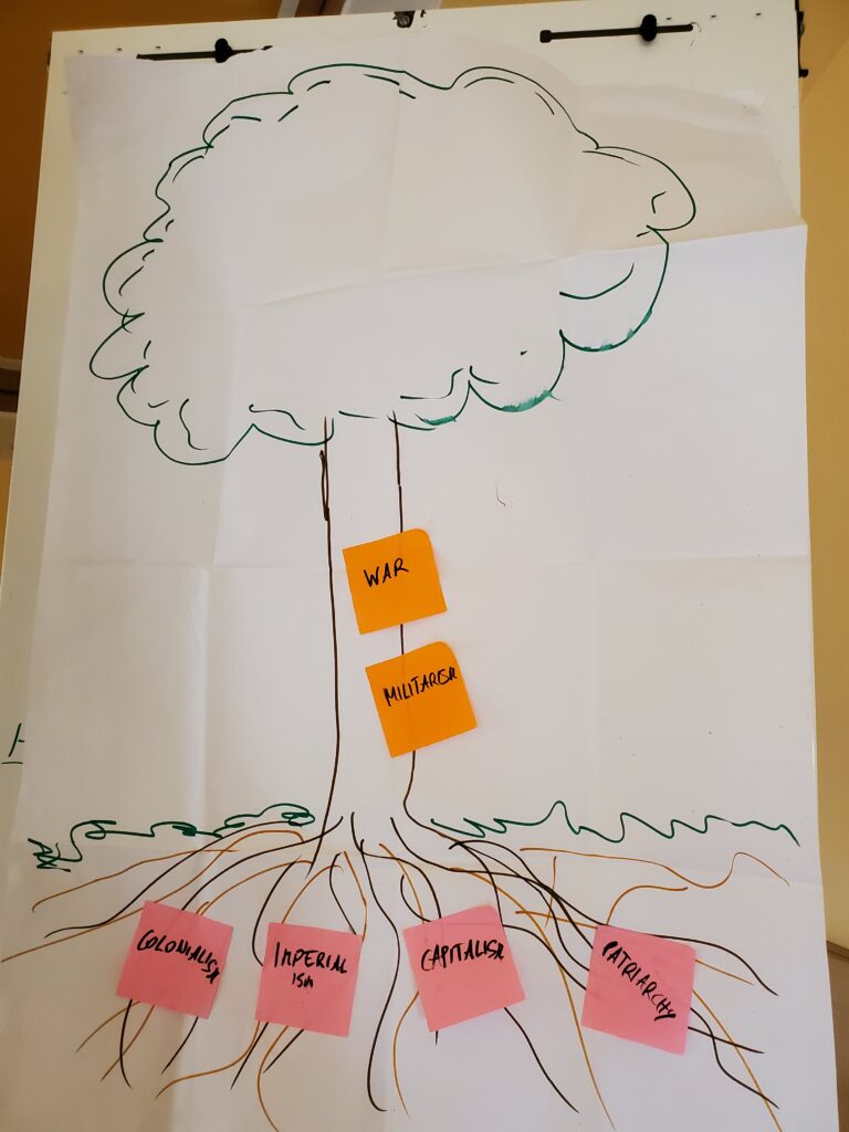 Die Infomaterialien gaben uns einen sehr guten Einstieg in das Thema (Anti-)Militarismus und dienten mir persönlich schon mal als erste Inspiration für meine eigene Themenfindung. Ziel des Workshops sollte es am Ende nämlich sein, eine eigene Kampagne zu einem antimilitaristischen Thema zu entwickeln und in der eigenen Stadt umzusetzen. Da es für viele von uns das erste Mal war, dass wir eine Kampagne entwickelten, gaben sich Danai und Thomas sehr viel Mühe, das Thema von Grund auf leicht zugänglich zu machen. Wir fingen an, indem wir uns in Gruppenarbeit mit historischen und aktuellen antimilitaristischen Kampagnen beschäftigten. Ich konnte aus dem Lernen über die vielen erfolgreichen, gewaltfreien Widerständen sehr viel Kraft ziehen. Und ich merkte, wie es mir Zuversicht schenkte und ich wieder einen optimistischeren Blick bekam, den ich manchmal aufgrund der Geschehnisse in der Welt zu verlieren drohe.