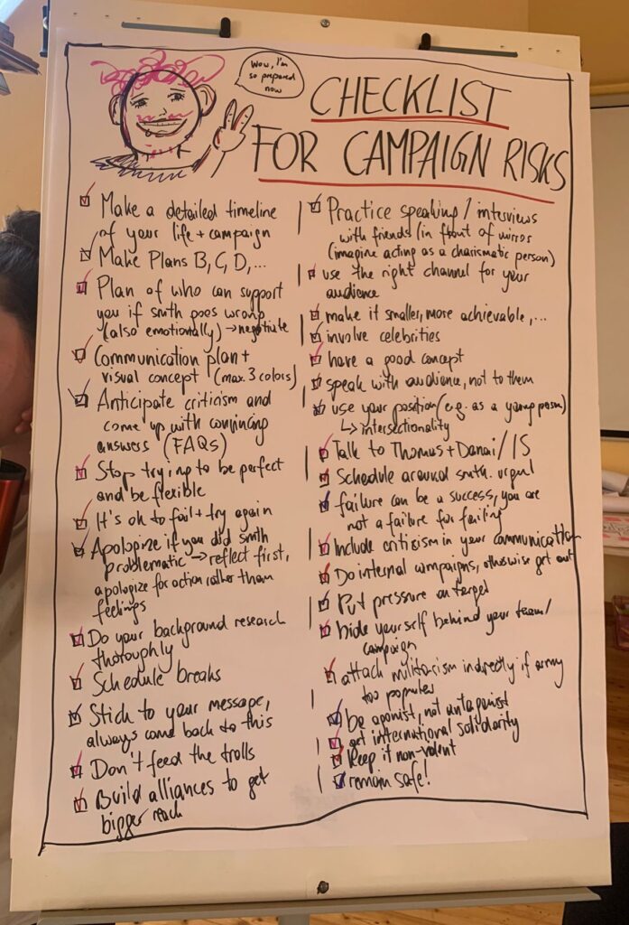 Am Donnerstag ging es darum, wie man Social Media dafür nutzen kann, um mit der Kampagne Aufmerksamkeit und dadurch die richtige Zielgruppe zu erreichen. Und darum, dass man sich auf jeden Fall Verbündete suchen und Netzwerke bilden muss, um Erfolg zu haben. Mit diesem neuen Wissen ging es dann in die finale Arbeitsphase, für die der gesamte Freitag eingeplant war. Vor dem Mittag hatten wir Zeit, uns gegenseitig unsere Kampagnen vorzustellen und uns letzte Tipps und Motivation zu geben. Und auch Danai und Thomas standen uns stets zur Seite. Die beiden nahmen sich viel Zeit, um jede Person von uns beim Erarbeiten unserer Kampagne zu unterstützen und wichtige Fragen zu klären.