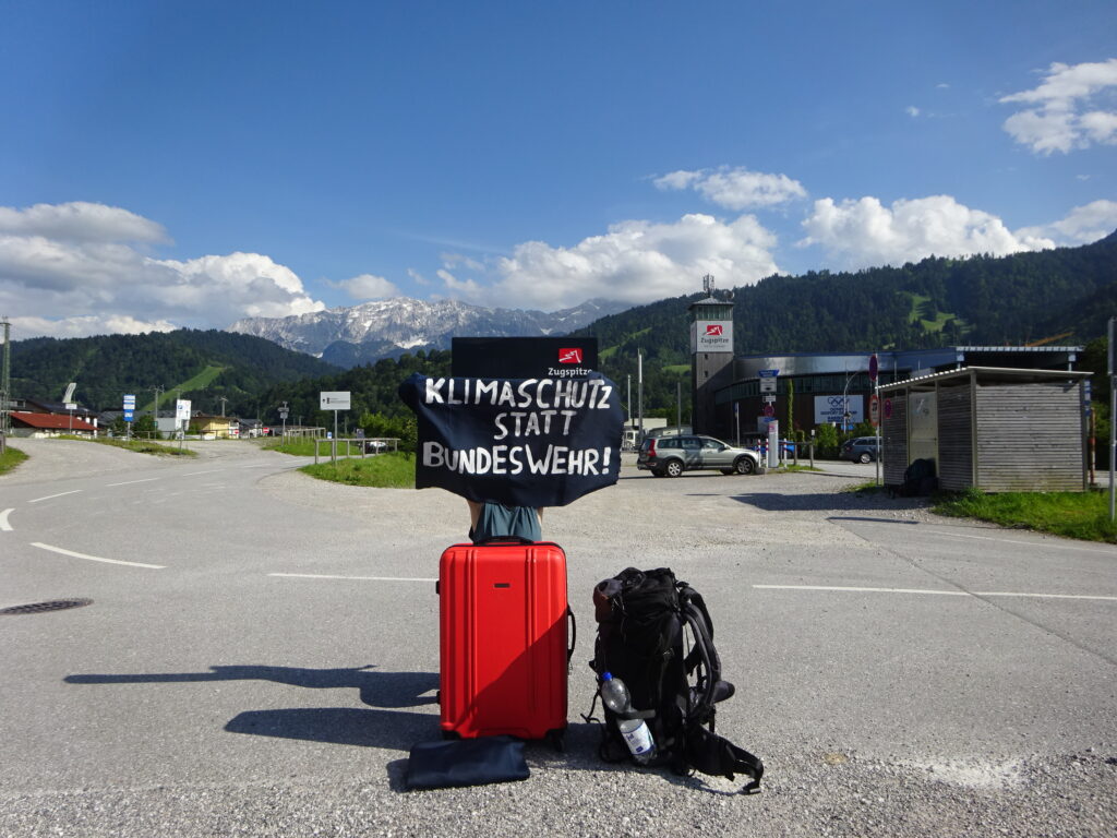 Tag der Bundeswehr in Berlin ist ja wegen zu viel Protest nicht. Deswegen sind einige von uns mit dem Jugendnetzwerk der DFG-VK in den Alpen (der Rest bereitet daheim emsig die Veranstaltung „Israel-bezogener Antisemitismus und die deutschen Linke“ vor). In Mittenwald sollte „Tag der Bundeswehr“ sein. Ist auch abgesagt. Wegen Flut in Bayern. Wir meinen: Eine super Gelegenheit, um deutlich zu machen, dass wir Klimaschutz statt Militär brauchen.