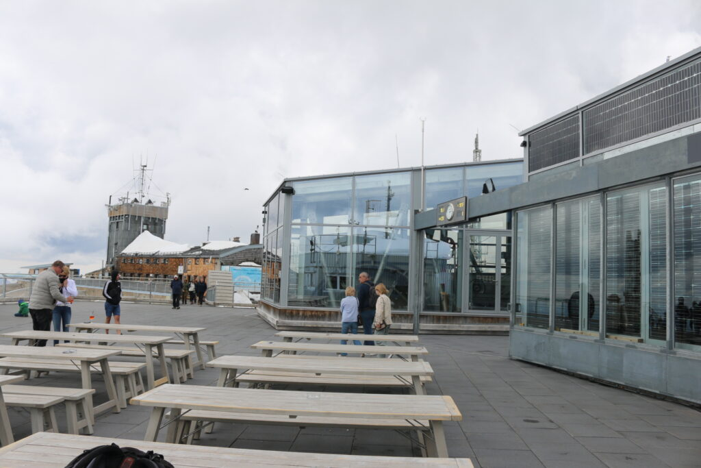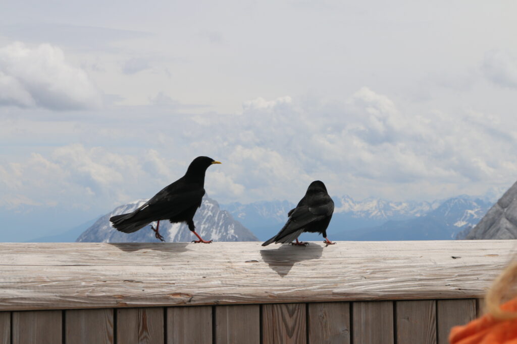 Als wir zur Bergstation zurückkommen große Erleichterung: Immer noch keine Polizei-Hundertschaft weit und breit! Wir ruhen uns aus, kontrollieren die Qualität der gemachten Bilder, laden unsere Smartphones, genießen die Aussicht, erfreuen uns an den Dohlen, kräftigen uns mit mitgebrachten Snacks und erkundigen uns bei ehemaligen Bergstationmitarbeitern, wie denn das mit Wasser und Abwasser funktioniert auf der Höhe.