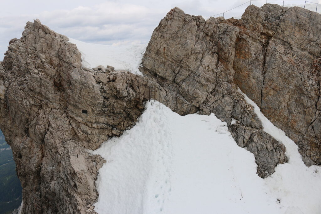 Eigentlich gibts dahin eine Tür, die ist aber gerade zu da der Weg zum Kreuz zu gefährlich ist. Da das Team der Zugspitze aber genau ihre Bergsteiger*innenkollegen kennt und weiß das niemand fast 3000 Meter hochklettert um dann vor dem letzten Mini-Hügel aufzugeben, egal wie gefährlich, gibts auf der Dachterasse der Zugspitzenstation im 3. Stock eine Leiter.