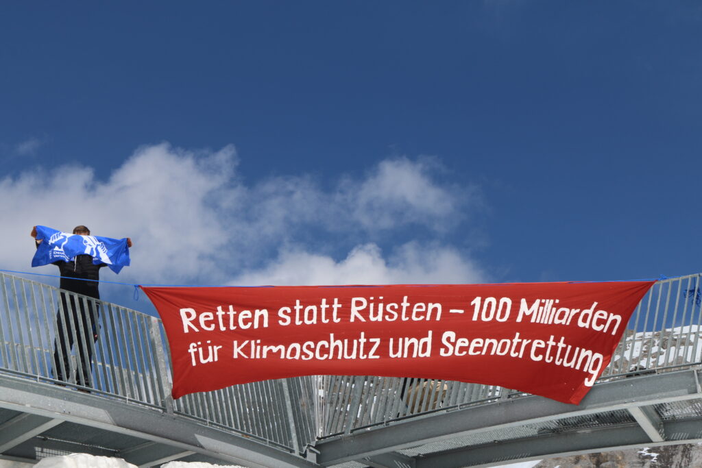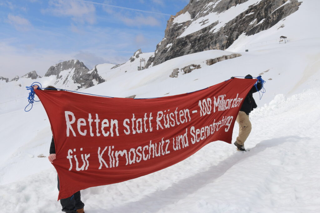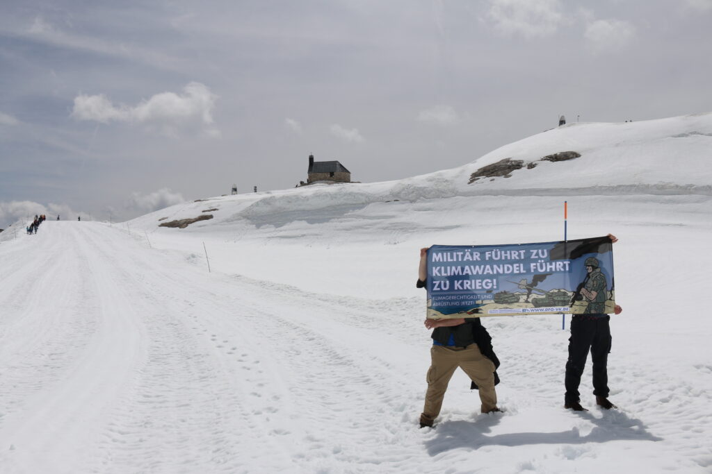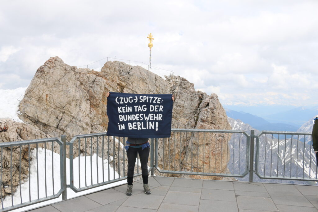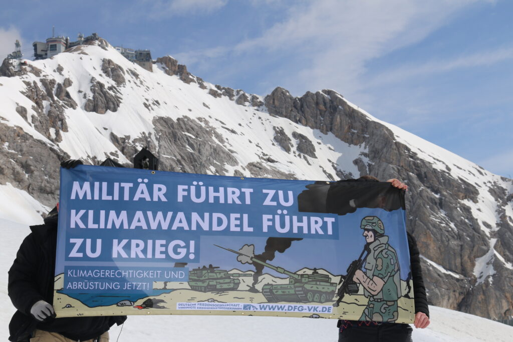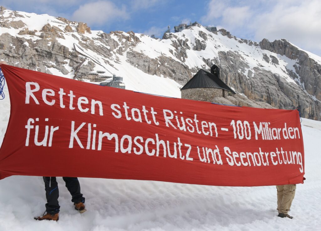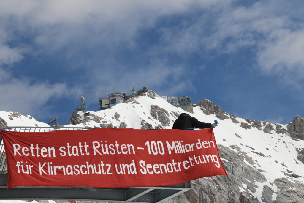 Protest gegen den Tag der Bundeswehr: „Retten statt rüsten!“ am Gletscher auf der Zugspitze