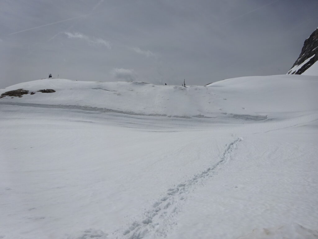 Nach etwas über eine Stunde Fotoshooting mit Bannern und Fahnen geht um Punkt 11 Uhr die Gletscherführung los. Das ist ganz praktisch, da wir da auch noch Bilder machen wollen, aber nicht im mehrere Meter hohen Schnee verschwinden wollen. Zusammen mit etwa 30 weiteren Leuten und einem Guide gehts im Schneckentempo im Gänsemarsch durchs Schneefeld quer über den Gletscher. Nach zig mal bis zum Knie im Schnee einsinken haben wir nach ca. 400 Meter das Schneefeld über den Gletscher überquert.