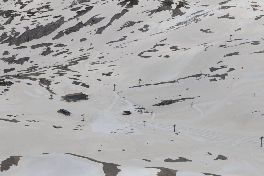 Durch ein Fenster fällt unser Blick auf die Ski-Piste: Die Sonne strahlt, der Schnee funkelt. Vom angesagten schlechten Wetter ist nichts zu bemerken.
