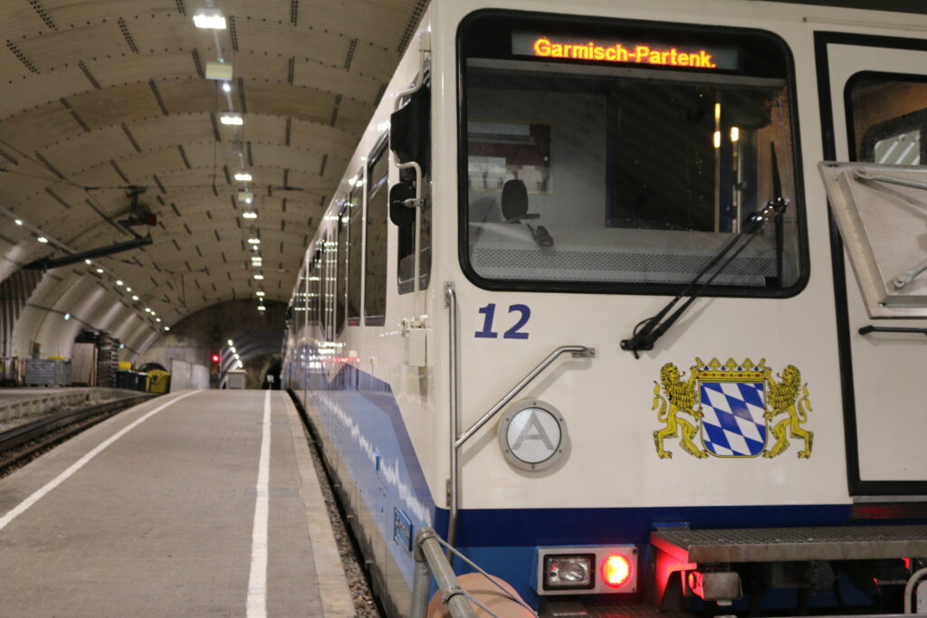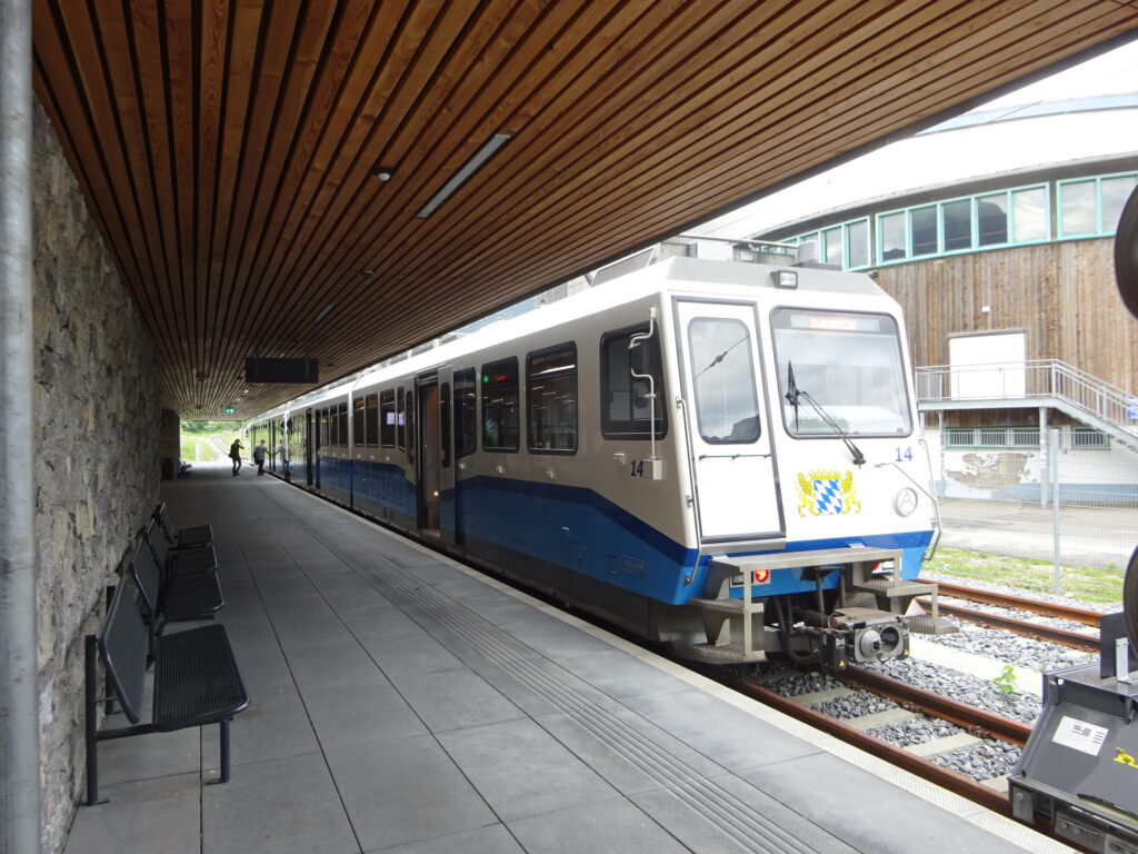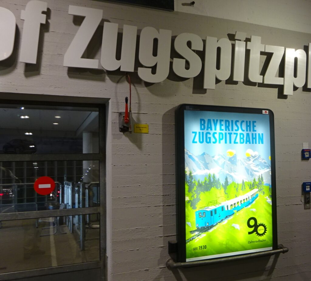 Die Bahn fährt erst als normaler Stromzug. Das D-Land-Ticket gilt hier zunächst (bis zum Eibsee). Es wird einmal noch im Tal kontrolliert. Ab Grainau ist Zahnrad-Betrieb. Es ruckelt mehr und die Bahn fährt nur noch 20 km/h. Nach Eibsee gehts steil bergauf. Jetzt verstehen wir den merkwürdigen Winkel der Sitzbänke. Auf der Hälfte der Strecke bei Riffelriff oder so gehts in den Tunnel. Die Notfallräume hier sind vielleicht auch gute Verstecke beim Atomkrieg.