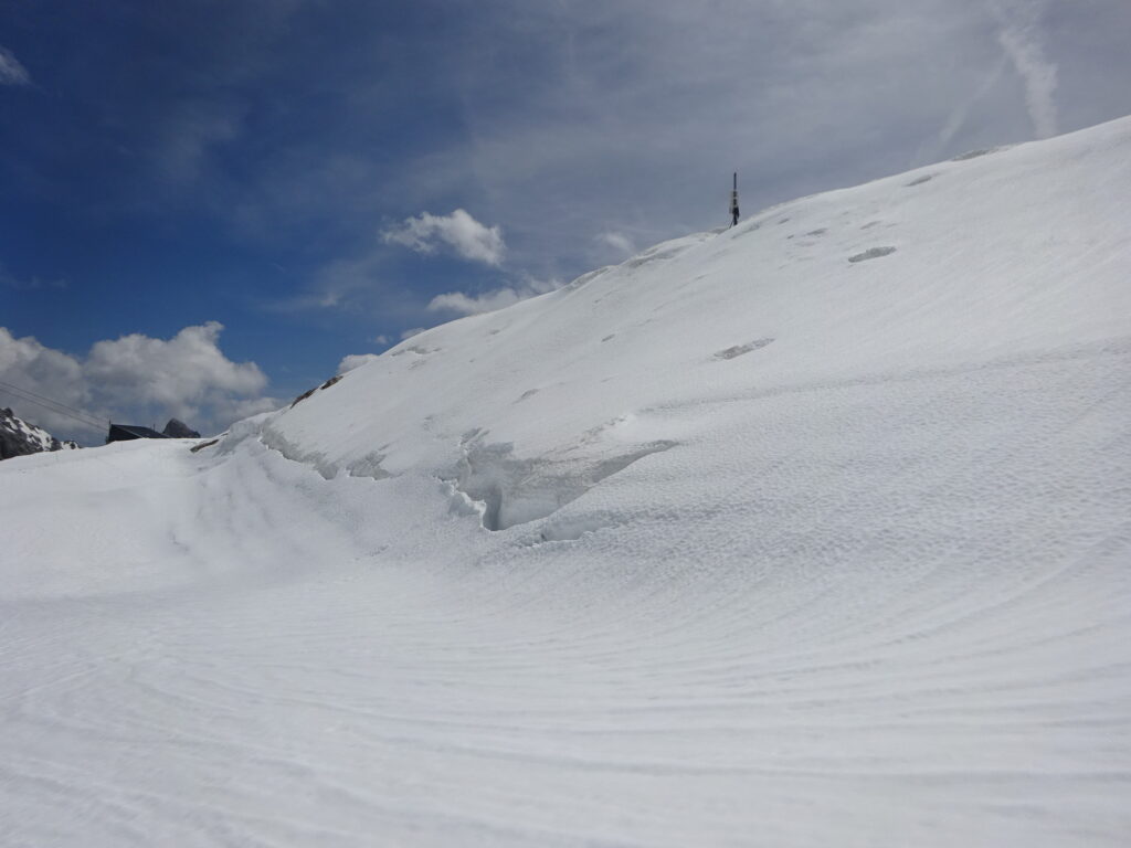 Die vom Restaurant kippen den geräumten Schnee hier von oben runter. Und durch Verdichtung und Absackungen entsteht die Kante, sagt unser Gletscher-Guide.