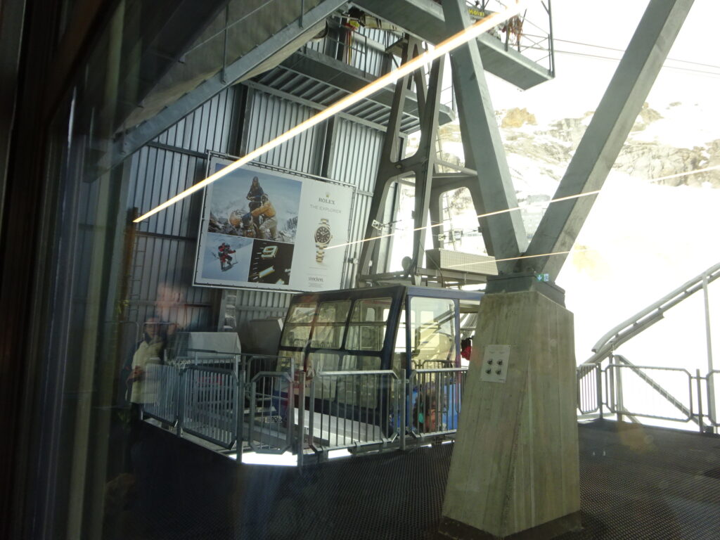Plötzlich ist wieder natürliches Licht. Wir sind am Gletscher-Bahnhof. Ein echter unterirdischer Berg-Bahnhof! Sogar mit Werbevitrinen.