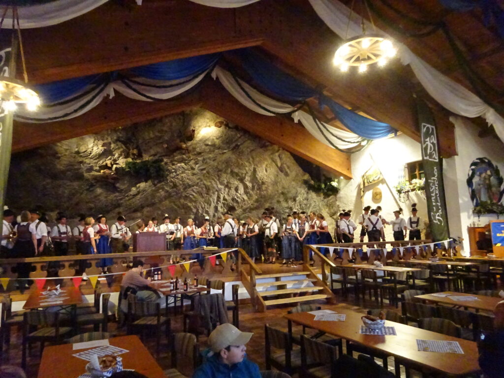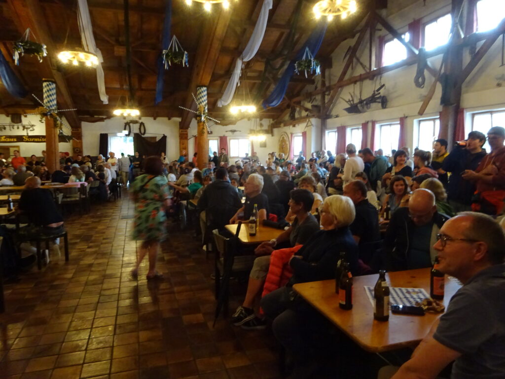 Zur Bayernhalle (dort sollte der Empfang wohl stattfinden haben wir munkeln hören) haben wir es irgendwann geschafft. Die Blasmusikkapellen haben schon gespielt und wir haben uns das ne Weile angeschaut bzw. angehört. Lange ausgehalten haben wir es drinnnen jedoch nicht (viel zu warm, Leute die sich beschweren, man stünde im Weg und ungebeten an einem rumgrabbeln wenn sie nicht schnell genug genug Aufmerksamkeit bekommen…).