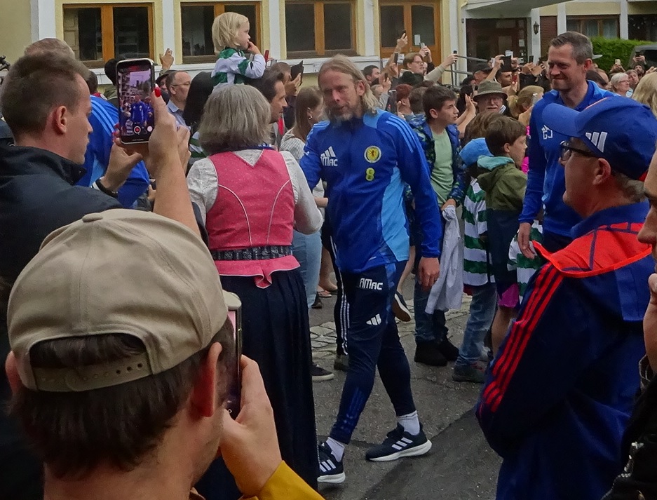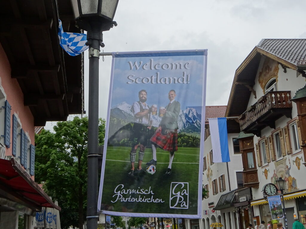 Wir haben der Schottischen Nationalmannschaft gewunken. Die Schottische Nationalmannschaft hat für fünf Tage ihr Quartier in Garmisch-Partenkirchen. Heute sind sie angekommen und wir konnten es nicht lassen, uns den Empfang anzuschauen. Das war allerdings ein kleines Suchspiel. Denn wegen Gewitter fällt die angekündigte Parade der Blaskapellen des Ortes aus. Ein paar Leute haben im Kurpark gewartet, ein paar sind umhergeirrt und wir haben uns gefragt, wem wir wohl am besten hinterherlaufen. Den Leuten im Dirndl oder im Schottenrock? Denen in Lederhose oder im Triko der Schotten?