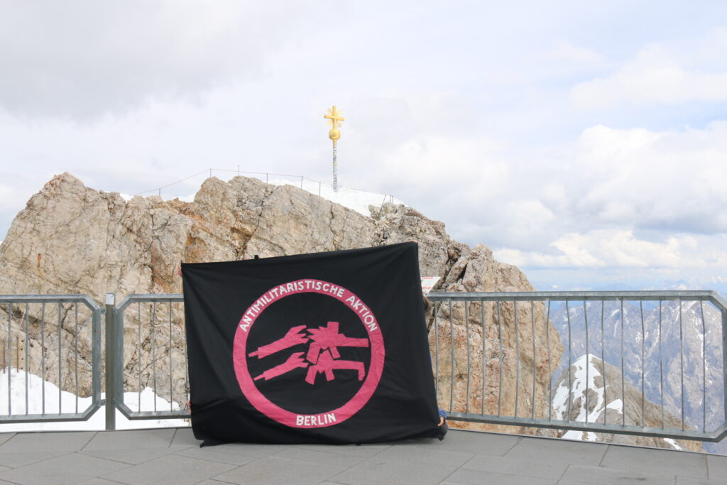 Nicht einmal fast 3000 Meter über dem Meer ist das deutsche Militär am „Tag der Bundeswehr“ vor Protest sicher. Antimilitaristinnen enterten unangemeldet die Zugspitze. Am Gletscher hissten sie ein Banner mit der Aufschrift „Retten statt Rüsten – 100 Mrd. für Klimaschutz und Seenotrettung!“ Verantwortlich für die überraschende Aktion ist das Jugendnetzwerk der Deutschen Friedensgesellschaft-Vereinigte Kriegsgegnerinnen (DFG-VK) und die Antimilitaristische Aktion Berlin. „Hier am Gletscher ist die Klimakatastrophe direkt sichtbar“ sagt Jan Hansen, Sprecherin der Aktivistinnen. Deshalb setzen die pazifistischen Jugendorganisationen hier ein Zeichen gegen klimaschädliche Aufrüstung. „Statt immer mehr Geld in Waffen zu stecken, müssen wir die Transformation zur klimafreundlichen Wirtschaft und Seenotrettung im Mittelmeer finanzieren!“