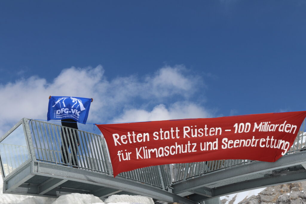 Protest gegen Bundeswehr auf der Zugspitze: „Retten statt Rüsten – 100 Mrd. für Klimaschutz und Seenotrettung“