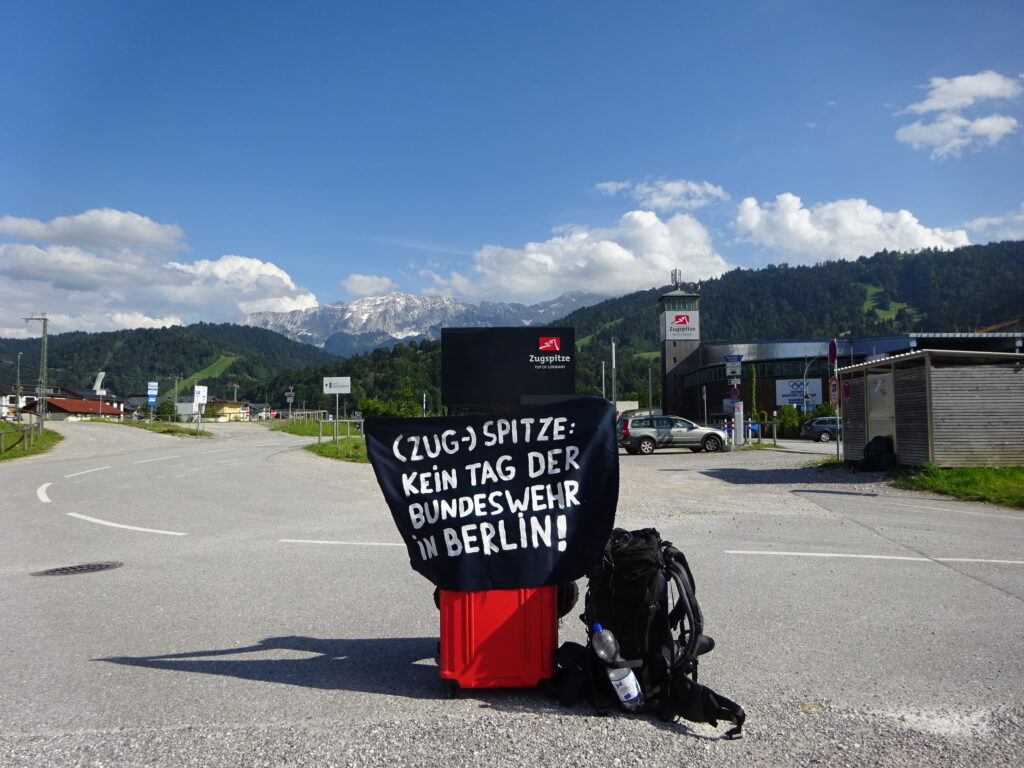 „Zug-Spitze!“ Kein Tag der Bundeswehr in Berlin! Deshalb war die Antimilitaristische Aktion Berlin zusammen mit dem U35-Netzwerk der DFG-VK in Bayern. In Mittenwald wollte die Bundeswehr sich selbst feiern. Zusätzlich zum Tag der Bundeswehr (6.Juni) sollte dort eine Reservistenmeisterschaft stattfinden. Da wollten wir stören: Mit einer Aktion am Gletscher auf der Zugspitze. Dort wollen wir gegen Aufrüstung und für mehr Klimaschutz und Seenotrettung protestieren. Hier die gesammelten Erlebnisberichte: