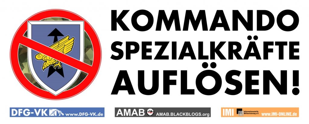 Ein weiteres Element unserer Aktion werden Aktivist*innen sein, die ein Transparent mit der Aufschrift „KOMMANDO SPEZIALKRÄFTE AUFLÖSEN“ und dem durchgestrichenen Wappen der Einheit halten werden.