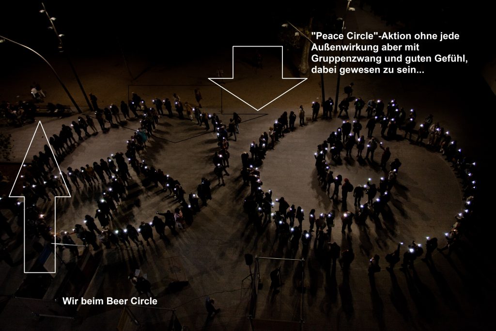 Vom Stopp-Ramstein-Papst und IBP-Geschäftsführer Reiner Braun konnten wir in Barcelona ein neues Bild gewinnen. Im Vorfeld der Reise hatten wir uns intensiv mit seinem Wirken bei „Stopp Ramstein“ auseinander gesetzt, nächtelang Reiner-Videos geschaut. Darauf basierend haben wir eine lange Kritik entwickelt, warum seine rechtsoffenen Posersprüche und seine Einladungen zur solidarischen Debatte mit Holocaust-Relativierer*innen krass uncool sind: