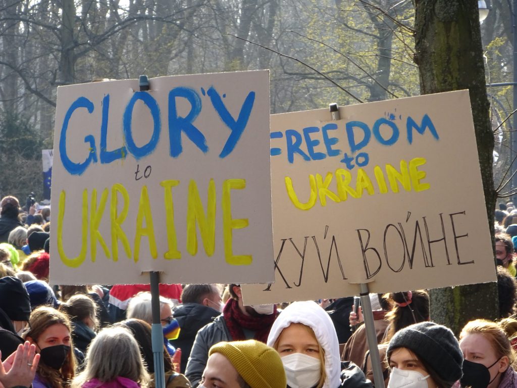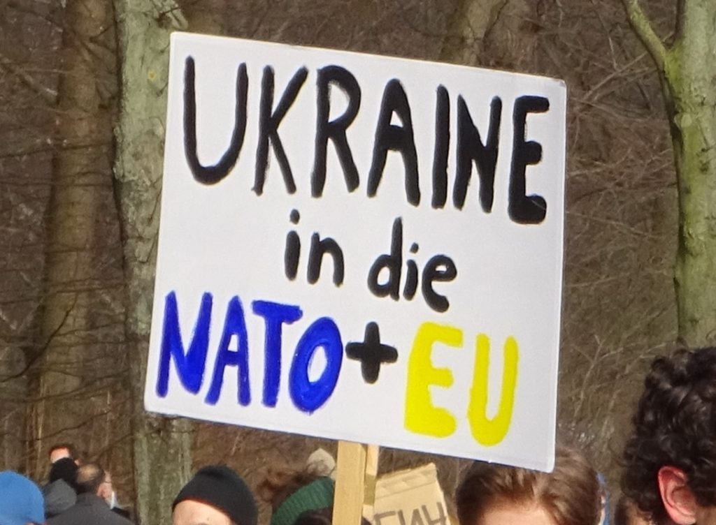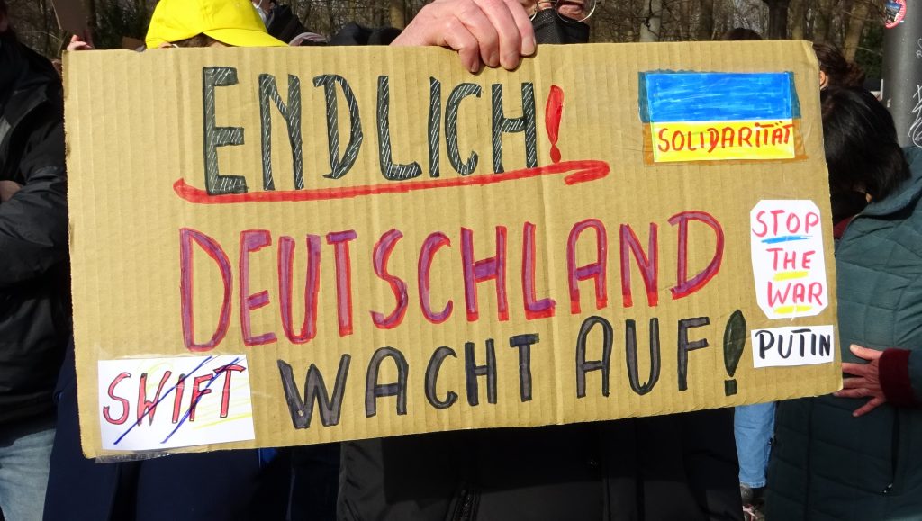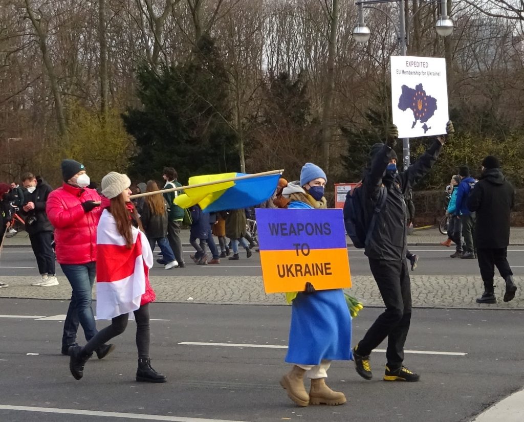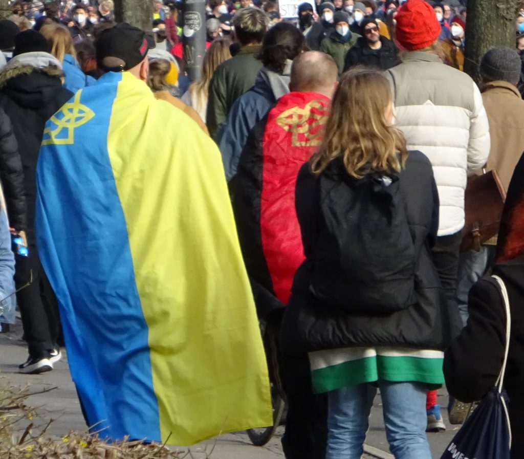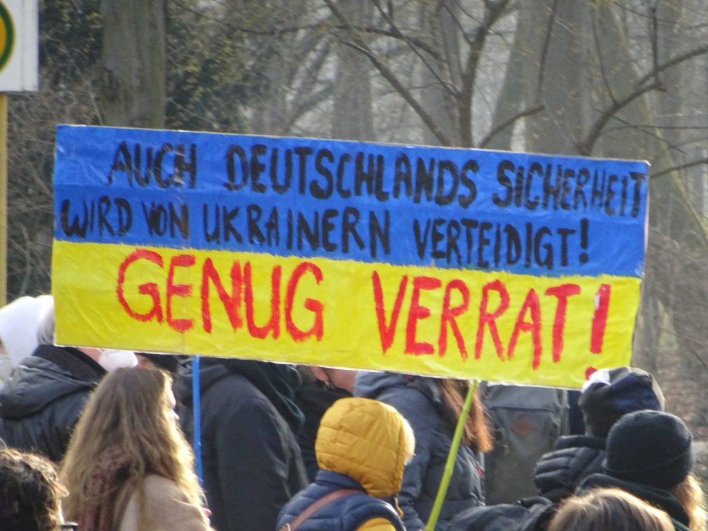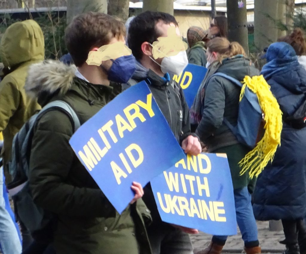 Weit verbreitet war ein Hoch auf die Regierung: Blaue Europafahnen mit gelben Sternchen passen ja auch gut zum Blau-Gelb der Ukrainischen Flagge. Vom Podium wurden von Redner*in Waffenlieferungen gefordert. Das unterstützen viele Leute, die die Demo besucht haben: