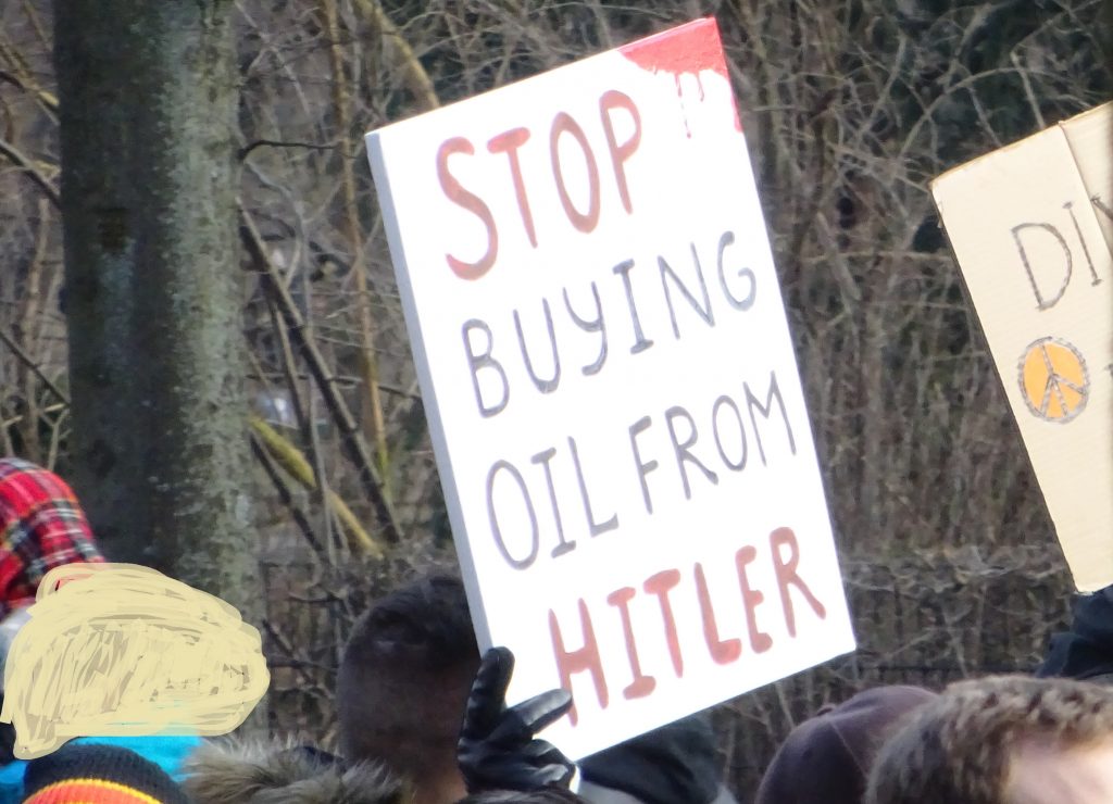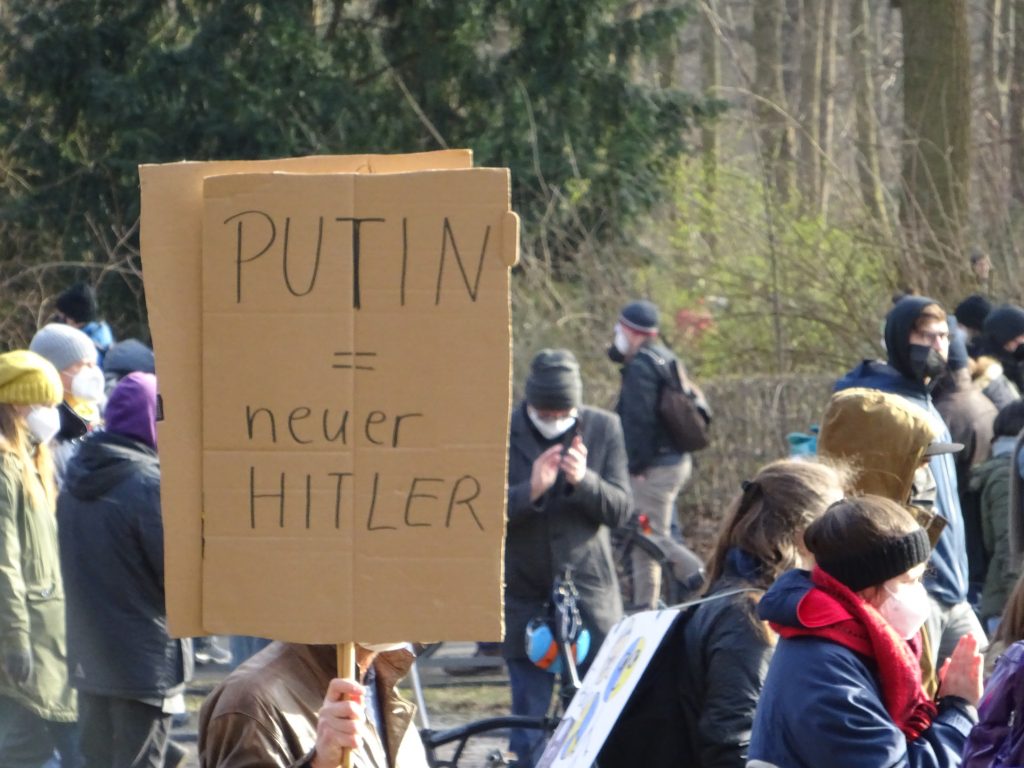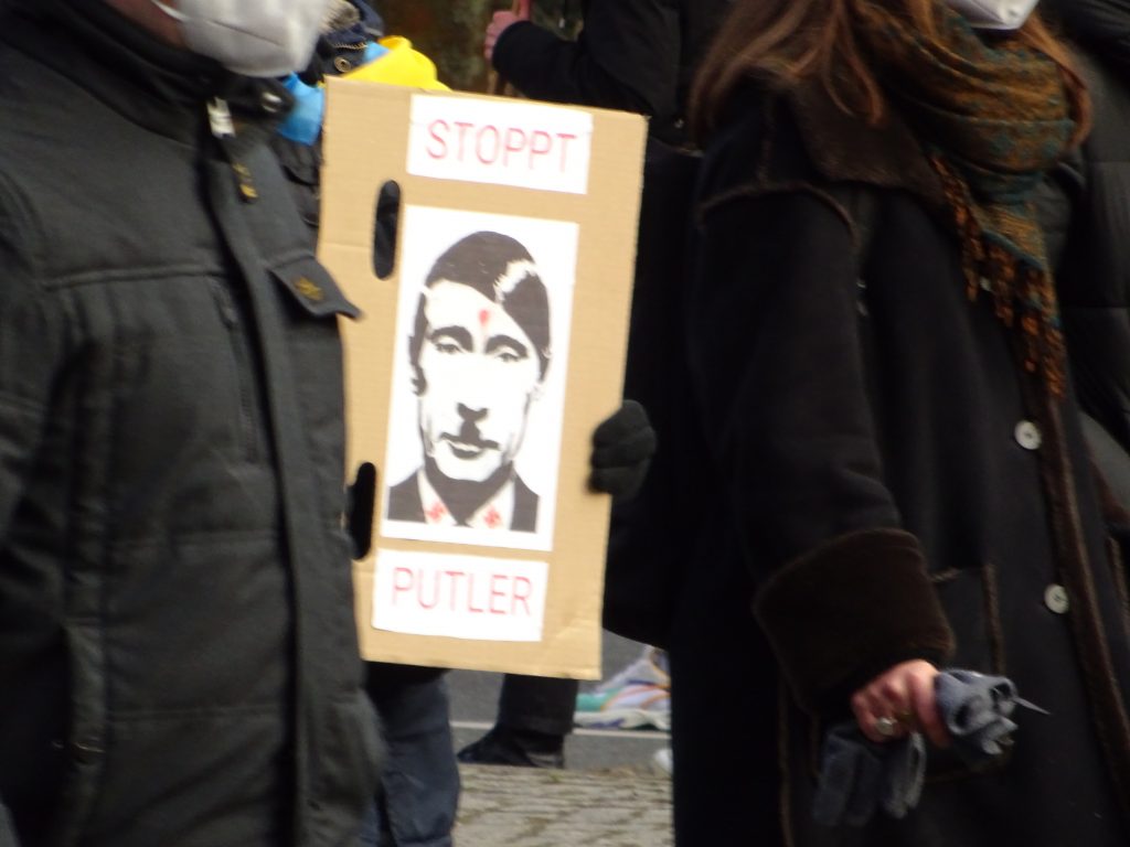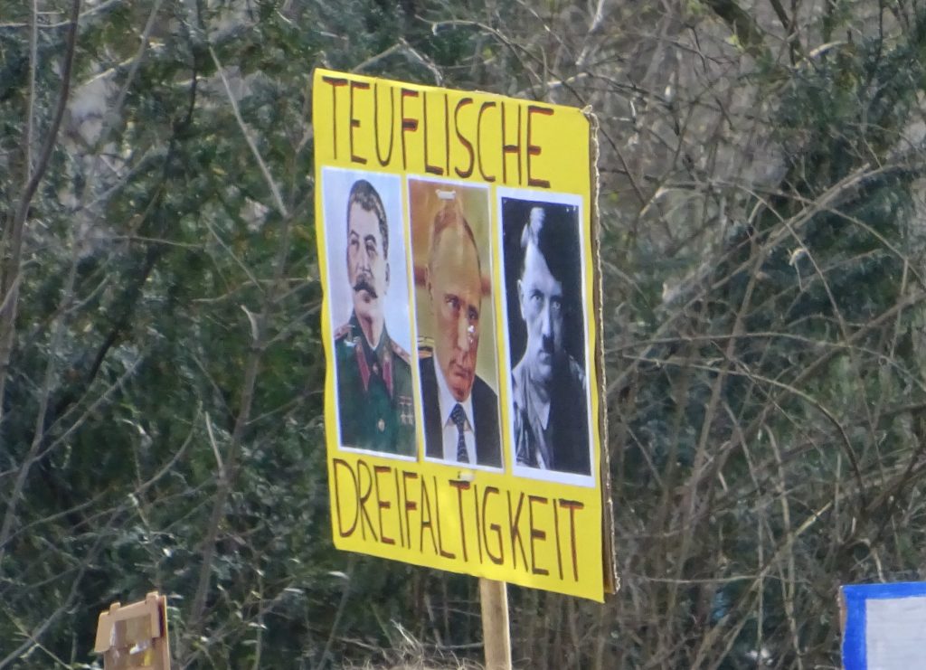 Hoch im Kurs standen jedoch auch Gleichsetzungen von Putin mit Hitler. Es ist völig geschichtsvergessen und die deutschen Verbrechen relativierend, wenn man Hitler, die Nazis, die Shoa, usw. mit einem gernegroßen Wald-und-Wiesen-Westentaschen-Diktatörchen wie Putin gleichsetzt. Hier zeigt sich, wie Vergangenheitsbewältigung in der Friedensbewegung funktioniert. Statt was sinnvolles zur deutschen Geschichte zu sagen und Konsequenzen zu ziehen, schafft man sich ein gutes Gewissen, indem man Hitler völlig kontextlos mit den Bad Guys anderer Länder zusammen wirft. Quasi nebenbei tut man damit so, als seien die Nazis eine kleine Clique gewesen, die 1945 wieder in ihr Ufo gestiegen sei und weg war. Das negiert, dass Millionen Deutsche die Naziherrschaft geil fangen und sich nach Strich und Faden an ihren Opfern bereichert haben.