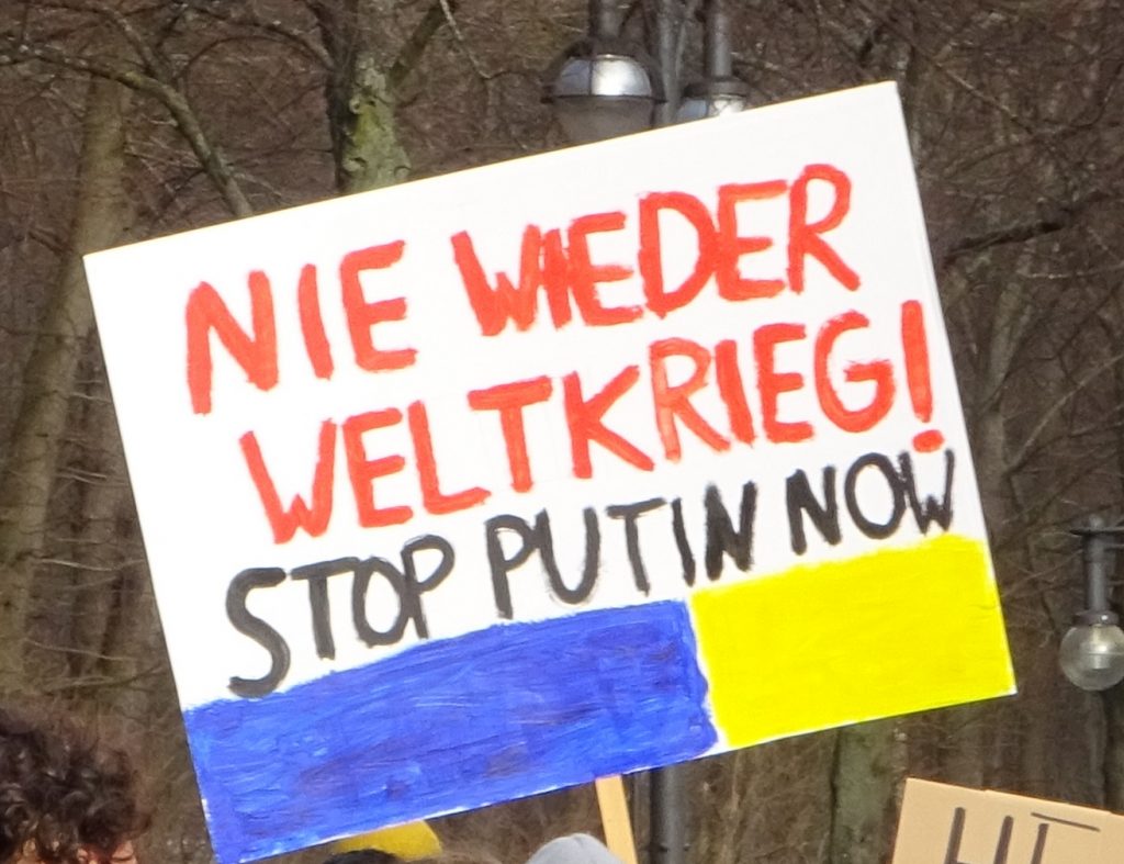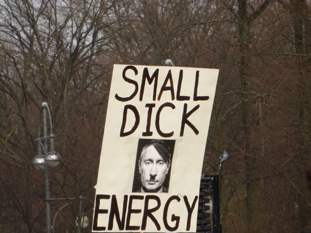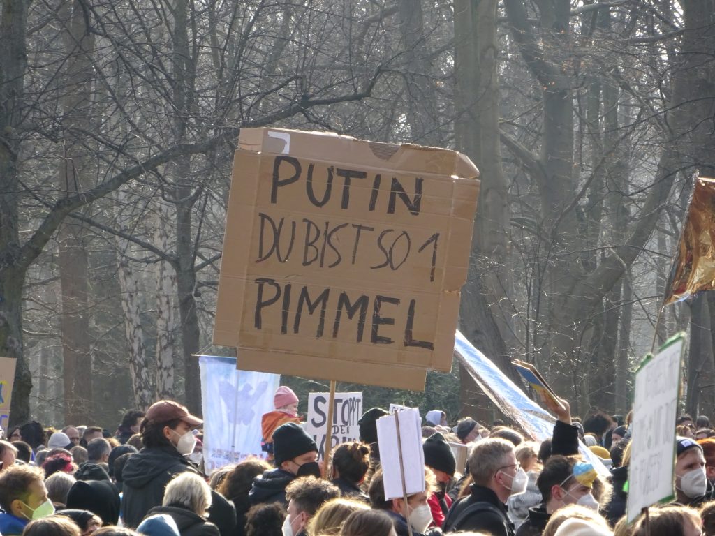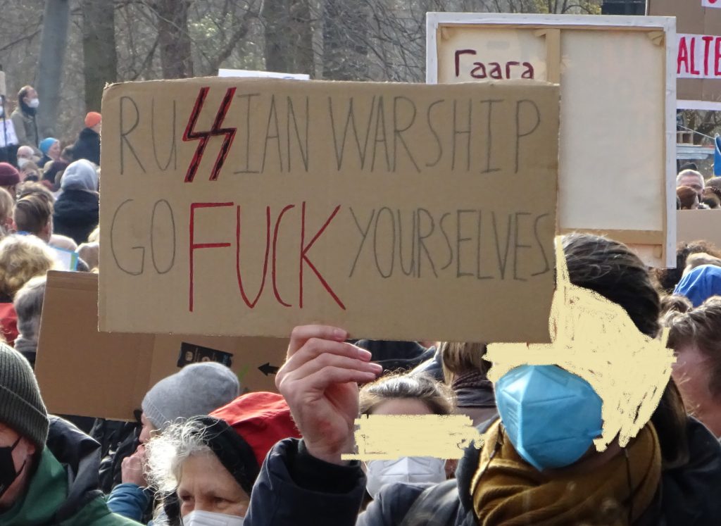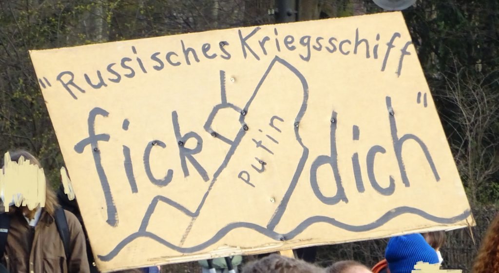 Wir waren auf der großen Demo am 27. Februar 2022 zwischen Brandenburger Siegtor und dem speerschen Triumphpimmel (siehe das Beweisfoto oben). Bis auf ein sonderbares Gefühl, weil sich eine Friedensdemo ausgerechnet hier trifft, war anfangs das Feeling noch ganz ok. Nette Leute mit Durchsagen, die sich bedanken, dass man da ist und brav weiter geht. So einfach und easy sind wir selten gelobt worden. Doch dann trafen wir Solidaritätsbekundungen mit „dem ukranischen Volk“ und Rufe nach Militärintervention und Aufrüstung. Und jede Menge Schilder mit sexistischen Dreck und auf einen Wettbewerb, wer den dümmsten Nazi-Vergleich macht. Unterm Strich blieb ein Gefühl der Sinnlosigkeit. Wir haben uns selten beim Politik machen so wenig wirkmächtig gefühlt wie gestern.