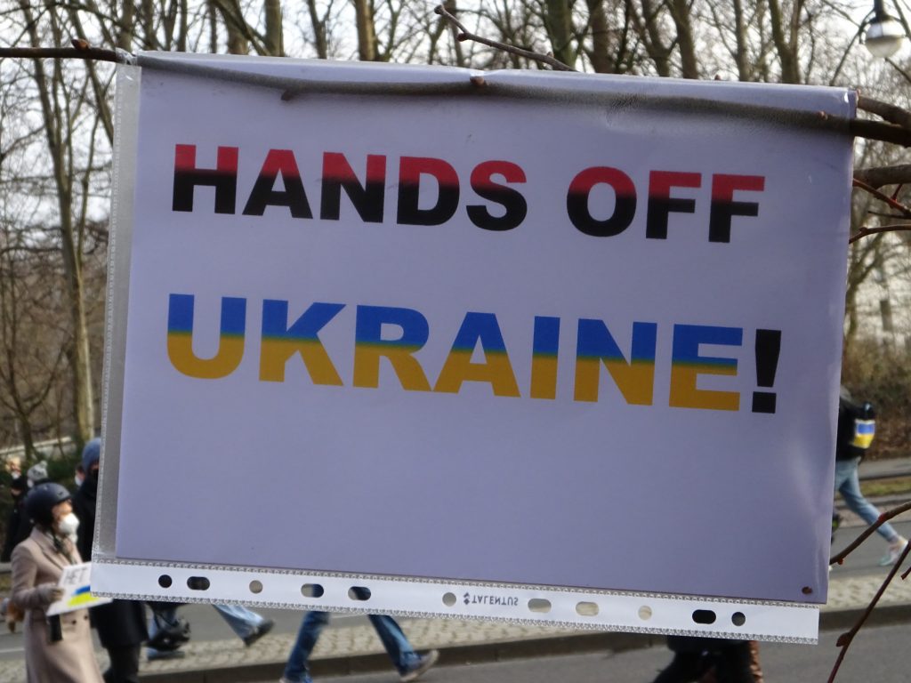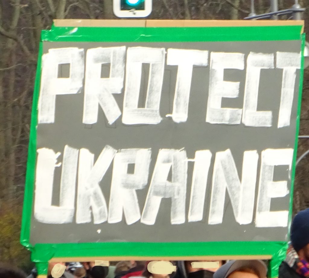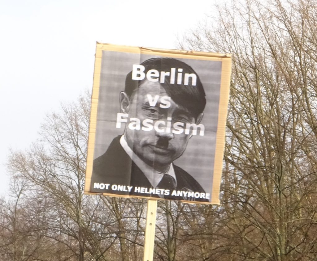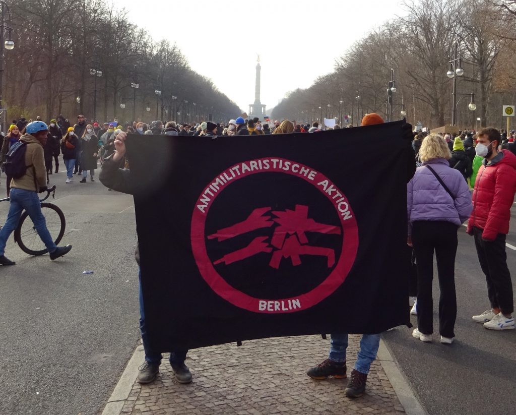Wir waren auf der großen Demo am 27. Februar 2022 zwischen Brandenburger Siegtor und dem speerschen Triumphpimmel (siehe das Beweisfoto oben). Bis auf ein sonderbares Gefühl, weil sich eine Friedensdemo ausgerechnet hier trifft, war anfangs das Feeling noch ganz ok. Nette Leute mit Durchsagen, die sich bedanken, dass man da ist und brav weiter geht. So einfach und easy sind wir selten gelobt worden. Doch dann trafen wir Solidaritätsbekundungen mit „dem ukranischen Volk“ und Rufe nach Militärintervention und Aufrüstung. Und jede Menge Schilder mit sexistischen Dreck und auf einen Wettbewerb, wer den dümmsten Nazi-Vergleich macht. Unterm Strich blieb ein Gefühl der Sinnlosigkeit. Wir haben uns selten beim Politik machen so wenig wirkmächtig gefühlt wie gestern.