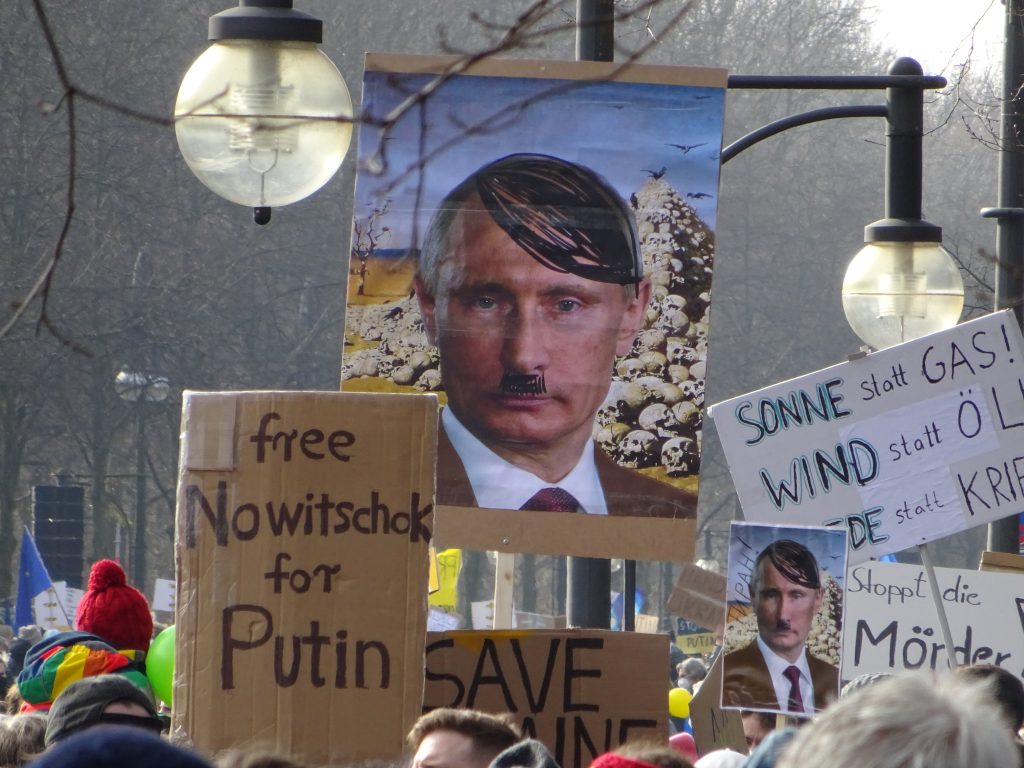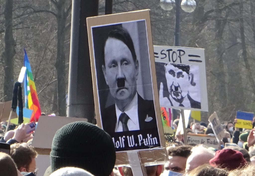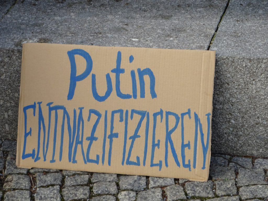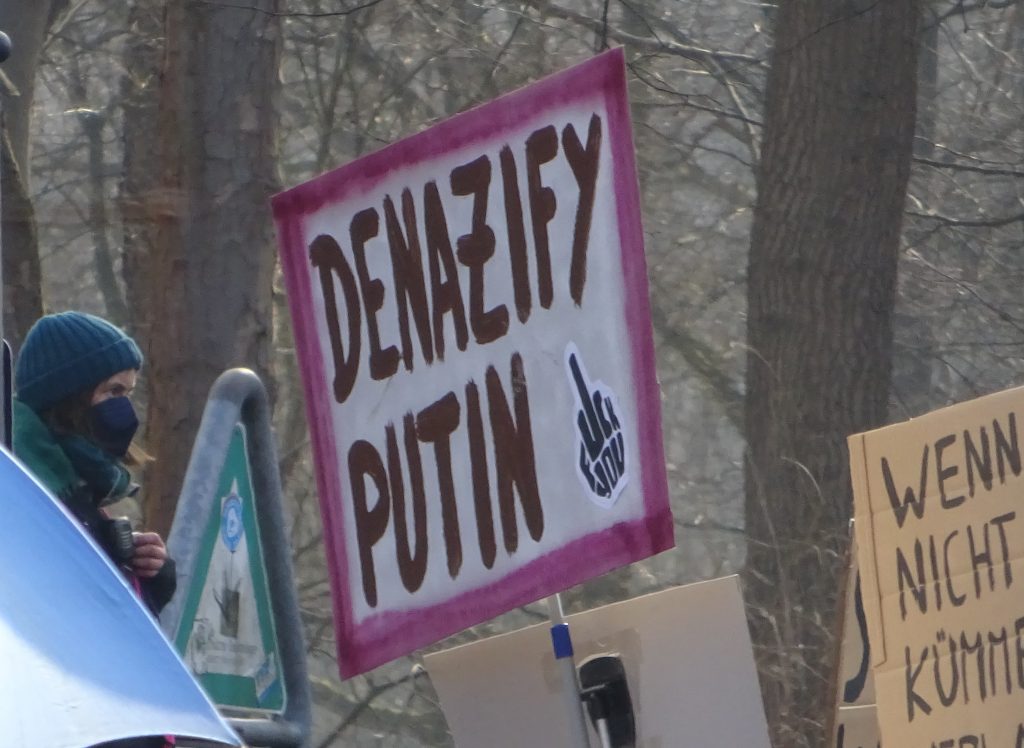 Ganz ähnlich wirken Slogans, die Putins Wording von der angeblich notwendigen „Entnazifizerung“ der Ukraine gegen ihn selbst wenden. Das geschichtslose Wording wird dadurch nicht besser.