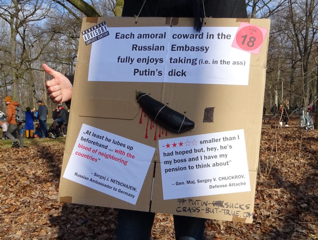 Außerdem sehr beliebt waren Schilder, die sich mit Herrn Putins Gemächt beschäftigten. Uneinigkeit herrschte jedoch, ob dieses nun sehr groß oder doch eher zu klein sei. Mehrere Menschen nutzten dies auch für homophobe Darstellungen.