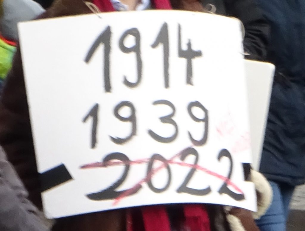 Völlig geschichtsvergessen sind auch Schilder, die den aktuellen Krieg in der Ukraine, an dem der Westen sich ja weigert, teilzunehmen, als „Weltkrieg“ darstellen. Zur Erinnerung: Wer fängt nochmal immer die Weltkriege an?