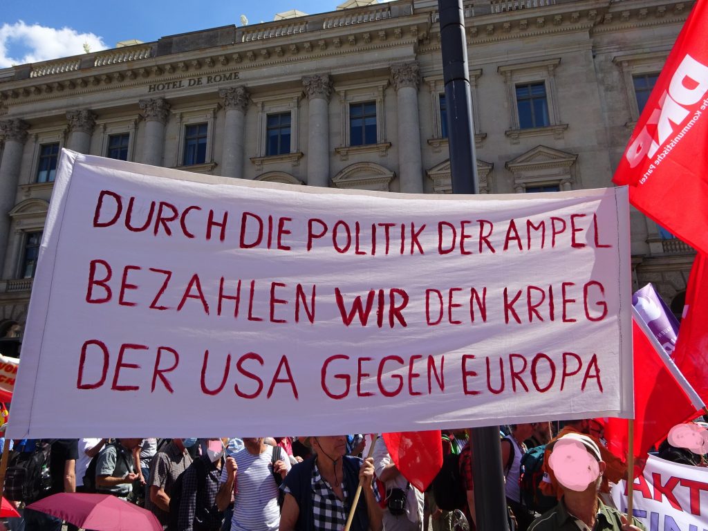 Schnell aus der U-Bahn raus, ich bin spät dran. Ich will zur Demo „Zivile Zeitenwende“. Die Demo wird vom Bundesausschuss Friedensratschlag organisiert. Der Aufruf zur „Großdemo“ wurde u.a. von der DFG-VK in Bayern, NRW, Flensburg, Lübeck und Jürgen Grässlin unterstützt. Der Bundessprecher*innenkreis der DFG-VK unterstützte die Demo nicht. Aus guten Gründen, wie sich zeigte. Auf der Rolltreppe fällt mir die Stille auf: Bin ich falsch? Müsste eine bundesweite Großdemo nicht auch eine große Geräuschkulisse haben?