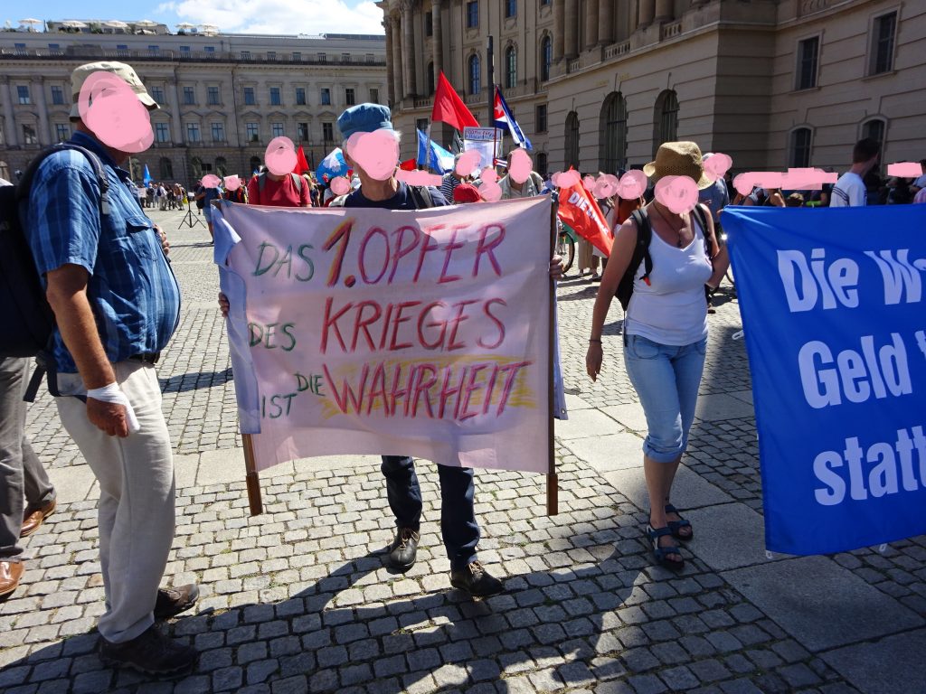 Rechtfertigt da schon wer im Vorfeld die hochgelogenen Teilnehmerzahlen, die der Bundesausschuss Friedensratschlag nach der Demo an die dpa melden wird? Oder eine Anspielung auf Butscha und die Verschwörungserzählungen dazu?